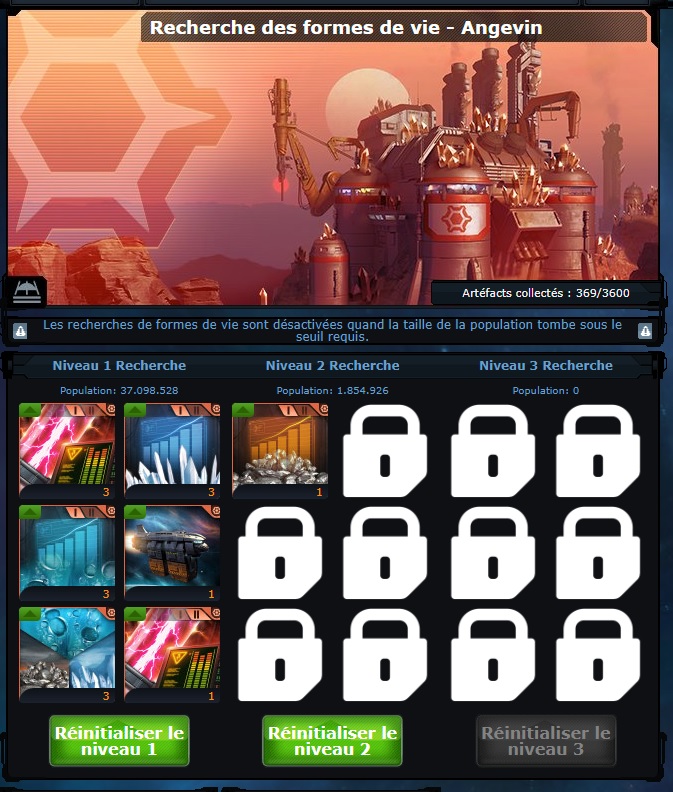 - Artefacts : capés à 3 600, ces objets permettent de choisir une technologie spécifique à chaque palier. Ils seront très vites importants pour personnaliser votre progression à travers les formes de vie, pensez donc à envoyer un maximum de flottes d’exploration.