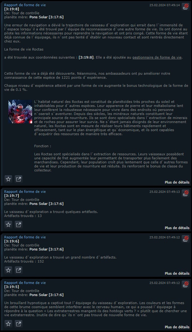 - Points d’expérience : ceux-ci s’appliquent aux différentes espèces. Si vous avez déjà découvert les Roctas et qu’une de vos flottes retombe dessus, vous obtiendrez de l’expérience les concernant – celle-ci peut être consultée n’importe quand dans le gestionnaire de formes de vie. Chaque niveau acquis augmente les bonus technologiques des espèces concernées de 0.1% ; certes, ça paraît peu, mais l’accumulation sur le long terme offre de très intéressants avantages !