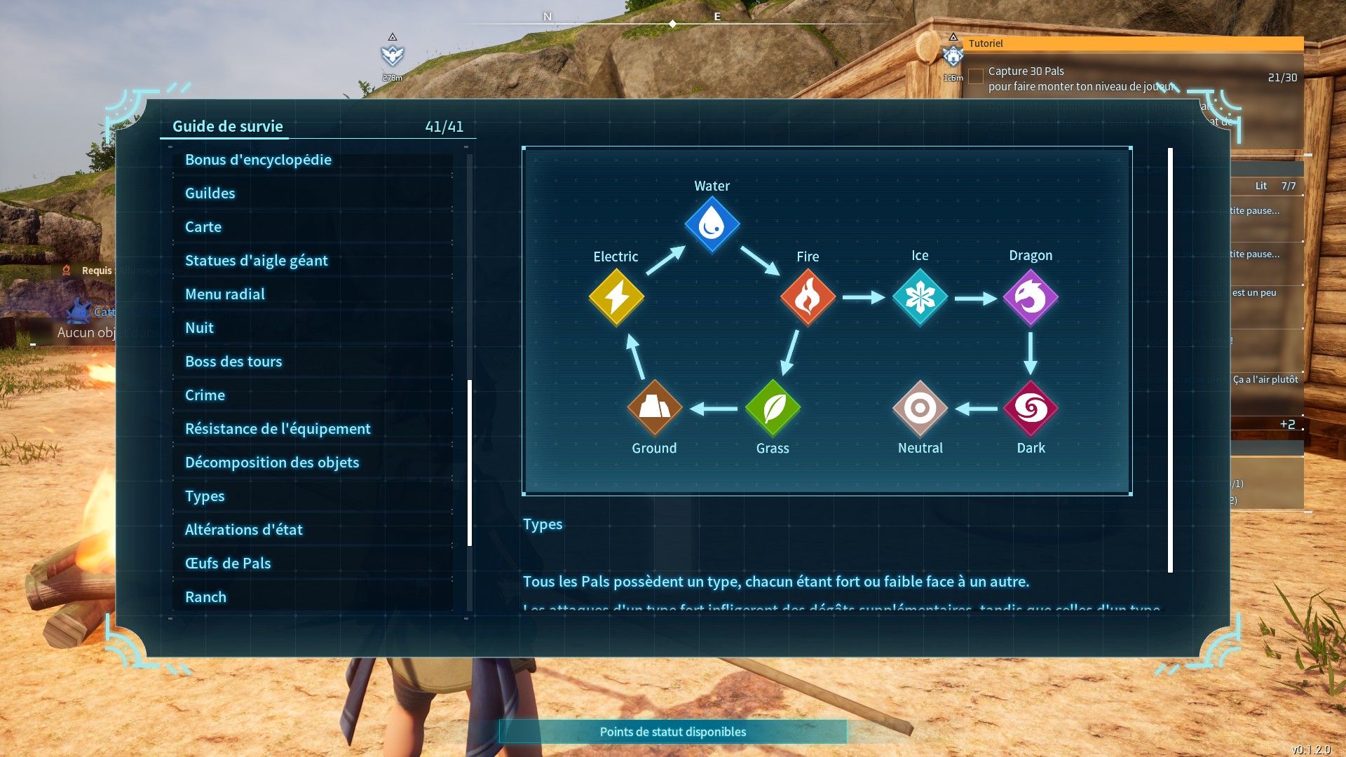Au début de votre aventure, essayez juste de capturer les Pals que vous trouverez, sans vous soucier du reste. Néanmoins, sachez que les Pals de type Feu sont efficaces à la fois contre ceux de Herbe et de Glace ; c’est a priori la seule occurrence où un Type a une supériorité sur deux autres, au lieu d’un seul. Certains Pals sont également de deux Types, mais ne se rencontrent que plus tard en jeu.