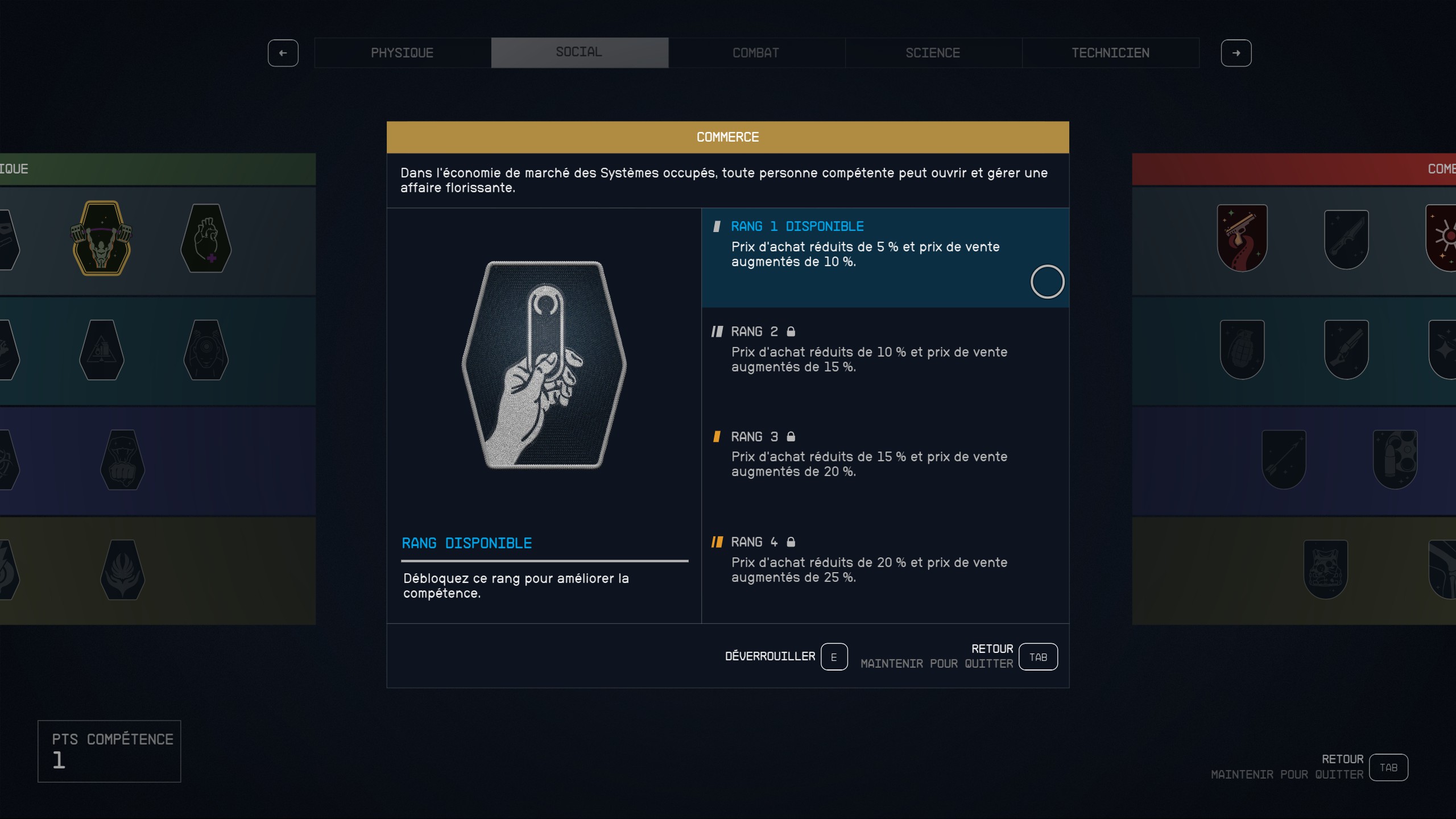 Pour pallier à cela, un talent en particulier vous sera bien utile : Commerce. Situé dans la catégorie « SOCIAL« , il vous permettra de bénéficier de meilleurs prix de vente auprès des marchands, ce qui permettra d’accumuler de jolies sommes sur le long terme !