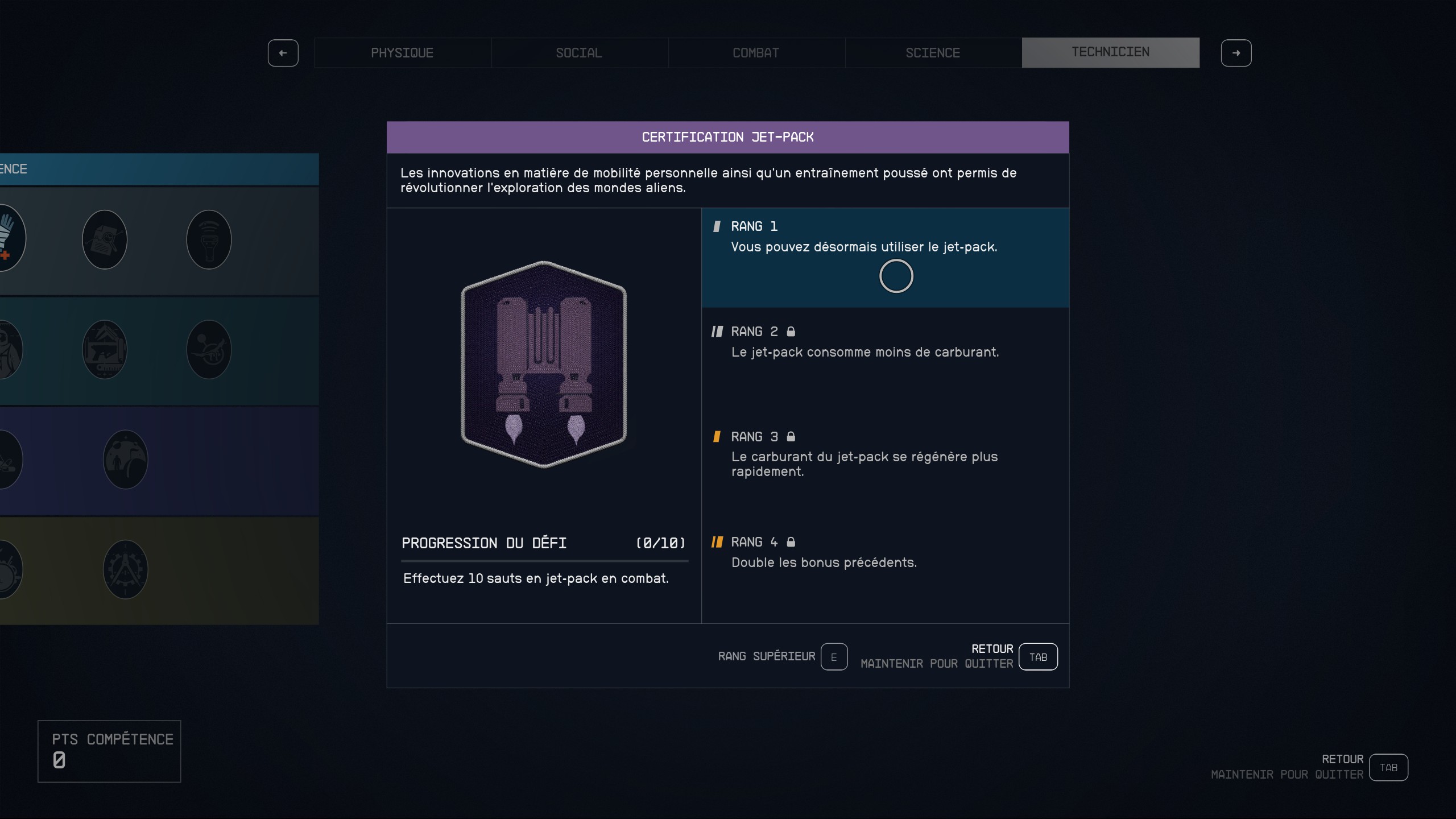 Il existe plusieurs nuances dans le vol en jetpack, et la première est parfaitement simple : il vous manque du skill ! En en effet, la compétence passive Certification Jet-pack (qui se débloque dans la première ligne de la catégorie Technicien) est nécessaire pour pouvoir utiliser cette pièce d’équipement, et commencer à faire des petits sauts de cabri.