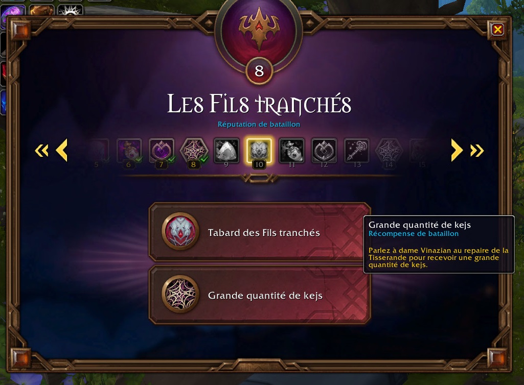 - Le Renom : augmenter votre réputation avec les Fils tranchés vous permettra d’obtenir naturellement des Kejs. Ceux-ci seront acquis à certains paliers, une fois que vous rendrez la quête obtenue d’office et qui est liée au Renom correspondant.