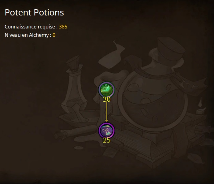 Meticulous Experimentation pour trouver une flasque. Les flacons vous amèneront directement à la compétence 100, même si les derniers points seront verts, donc essayer d’en cibler un durant vos try avec les herbes appropriées sera le meilleur moyen de compléter votre gain de niveau. - Si par malgré tout, vous êtes le joueur le moins chanceux du jeu, le moyen le plus rapide d’obtenir une recette qui vous permettra d’atteindre le niveau 100 est d’utiliser 30 points de connaissances dans les nœuds de spécialisation