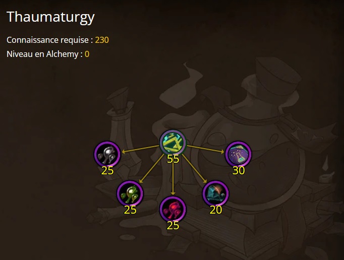 Thaumaturgy – Vous commencerez par vouloir y mettre 20 points afin de pouvoir passer à deux sous-spécialisations à la fois. Nous voulons deux sous-spé car l’une d’entre elles vous permettra de choisir votre « voie » de départ et l’autre augmentera considérablement le nombre de transmutations que vous pourrez effectuer presque immédiatement. Pour ce guide, nous supposerons que votre choix est