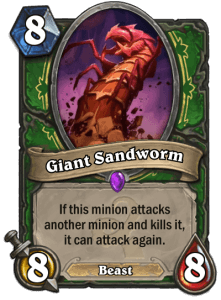 Niveau stats rien à dire, c’est correct. Par contre l’effet peut être assez monstrueux. En gros si il tue un serviteur, il peut ré attaquer. Avec 8 en valeur de défense, il est possible au tour suivant la pose de prendre plusieurs trades assez facilement pour peu qu’il y ait sur le plateau adverse de petits serviteurs avant de s’attaquer à un gros par exemple. Un combo dévastateur avec le courroux bestial et là vous obtenez un clean complet du plateau adverse plus 10 points de dégâts dans la tête de l’adversaire. Bon encore une hypothèse certes, mais ce combo, si de changement il n’y, sera sûrement joué. Après cela reste très axé late game donc à voir si des decks de ce genre émergent de manière viable en chasseur.