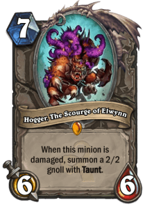 Et voici la corruption de Lardeur ! Carte qui n’est plus jouée depuis maintenant un bon moment. Un coût, des stats, et son effet modifié. Pour rappel la carte d’origine est une 4/4 pour 6 mana dont l’effet était d’invoquer un gnoll 2/2 avec provocation à la fin de votre tour. Le nouvel effet devient activable par la prise de dégât et donne donc accès de nouvelles possibilités d’actions pour plusieurs classes. Un mage pourra utiliser son pouvoir héroïque pour invoquer un gnoll afin de pouvoir temporiser des serviteurs; le guerrier via ses multiples Aoe ( sort de zone ) touchant tous les serviteurs; le prêtre pourra le soigner et ainsi maximiser son effet. Enfin ce ne sont que quelques hypothèses mais qui donnent un petit exemple.
