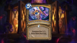 Son effet est d’invoquer 5 recrues de la main d’argent. Pour 5 mana je trouve ça un peu cher, surtout qu’un régiment de bataille fait actuellement mieux puisqu’il invoque 3 recrues de la main d’argent et vous offre une arme 1/4. En plus l’intendant ne sera plus disponible en mode standard donc plus d’éventuel combo. À voir au fur et à mesure de la sortie des autres cartes si elle peut dévoiler un meilleur potentiel. En attendant d’un point de vue personnel, je la trouve un peu faible.