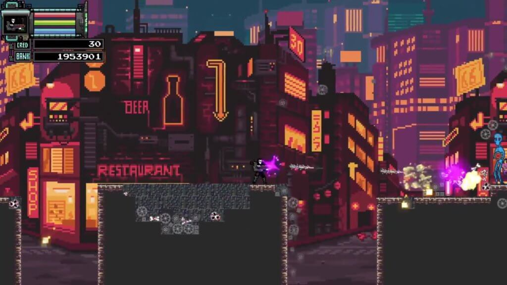 En effet, on passe de cités à la fois sombres et lumineuses à la Blade Runner à des jungles relaxantes, le tout servant de toile de fond pour détruire un maximum de trucs. Le pixel art n’empêche pas les couleurs de donner un magnifique aspect au jeu, mais c’est bien le côté défouloir du jeu qui fait son charme. Le personnage principal est doté de tout un arsenal d’armes destructrices, dont un canon monté dans son dos, au niveau du jetpack.