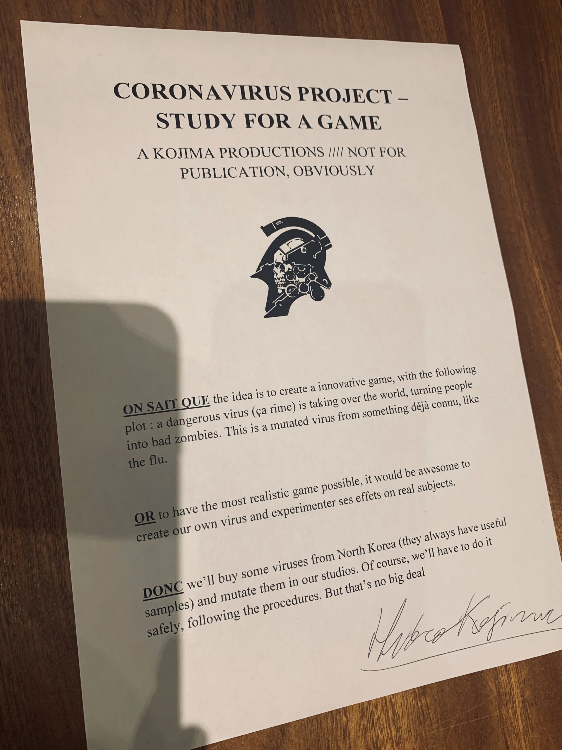 Effectivement, c’est comme qui dirait parti en cacahuètes. Pour le moment, on ignore comme la situation sera réglée, même si des journalistes du Roosevelt Post ont affirmé qu’une importante conversation téléphonique avait eu lieu entre Hideo Kojima et Lionel Jospin, au sujet de l’origine du coronavirus et de possibles traitements. Pour plus de détails, vous pouvez retrouver ci-dessous une photo d’un document interne, datant de l’ouverture du studio et juste avant le développement de leur premier jeu annulé :