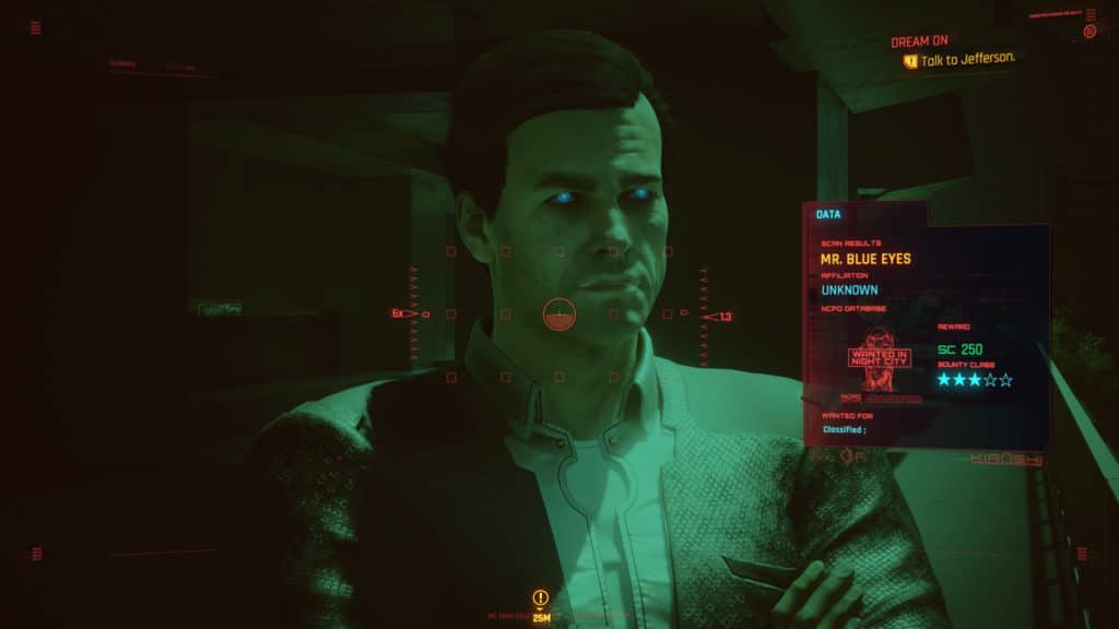 Lors de la conclusion de la quête Dream On, on rejoint Jefferson Peralez dans un parc public pour discuter un peu, sans savoir que l’on est observé. Un peu plus loin se trouve effectivement Mr Blue Eyes, qui regarde la scène depuis un balcon sans dire un mot. C’est particulièrement étrange car, quelques instants auparavant, V s’effondre en étant victime d’un hack à distance ; une voix inconnue et pas très engageante lui signifie d’ailleurs qu’il vaudrait mieux s’occuper de ses affaires.