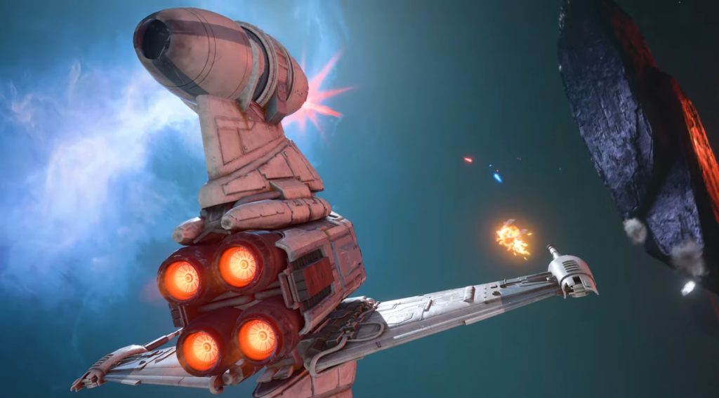 Commençons avec l’arrivée tant attendue du B-Wing, vaisseau iconique de l’Alliance Rebelle. Ce chasseur possède un armement lourd, un blindage plus que décent et, cerises sur le couscous, d’excellentes capacités d’évasion. Toute la structure du vaisseau pivote autour d’un axe central, permettant des acrobaties assez stylées.