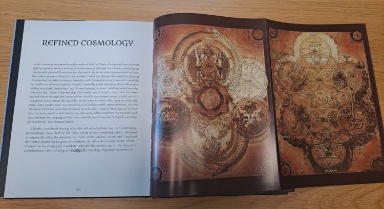 Il est intéressant de noter que les expressions « créer » et « remettre en ordre » sont notées comme synonyme par les Titans, ce qui pourrait éventuellement mener à des erreurs – intentionnelles ? – d’interprétation sur les actes du Panthéon. Toujours est-il que le Négociant trouve le point de vue des Titans aussi ridicule que arrogant, et nous fait la générosité de sa propre cartographie cosmologique :