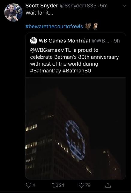 Le futur jeu Batman consacré à la Cour des Hiboux poursuit son teasing mystérieux ! En décembre 2018, un premier teasing de Warner Bros Montréal, suivi d’un second un mois plus tard, avait mis le feu aux poudres, avant qu’un illustrateur du studio ne dévoile par inadvertance quelques magnifiques concept arts. Pour les 80 ans du Chevalier Noir, le compte Twitter de Warner Bros a publié un message, lequel a été retweeté par Scott Snyder avec le hashtag #bewarethecourtofowls. Le monsieur est un auteur régulier et important de DC Comics, réputé pour son excellent run Court of Owls, paru en 2011. Il n’est donc pas improbable qu’il soit impliqué dans le jeu du studio montréalais, et connaissant son storytelling, c’est une excellente chose ! Si le tweet a rapidement été retiré, une capture d’écran prise par des internautes est venu immortaliser cet indice fort intéressant :
