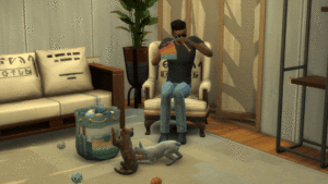 Le Sim du développeur SimGuruNinja tricote sur un fauteuil à bascule, sur les toilettes, à table.. Il ne s’arrête plus ! Nous découvrons qu’il peut tricoter des vêtements tels que des chaussettes, des pulls, des écharpes, mais pas que ! En effet, nos Sims pourront également tricoter des éléments de décoration – très colorés – comme des tapis ou des poufs.