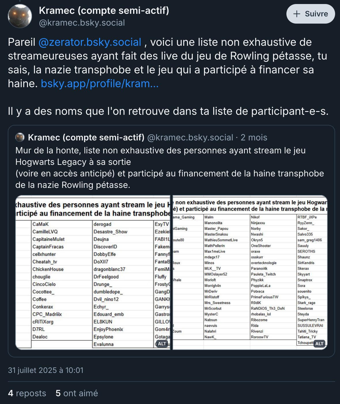 On ne peut que regretter que la publication d’un tel document serve à ostraciser des gens pour plaire à une meute hostile, qui ne supporte pas l’idée de points de vue différents. Mais peut-être qu’après tout, c’est désormais ce qu’est devenu le ZEvent : un meeting politique où les opinions contraires sont soumises à la censure.