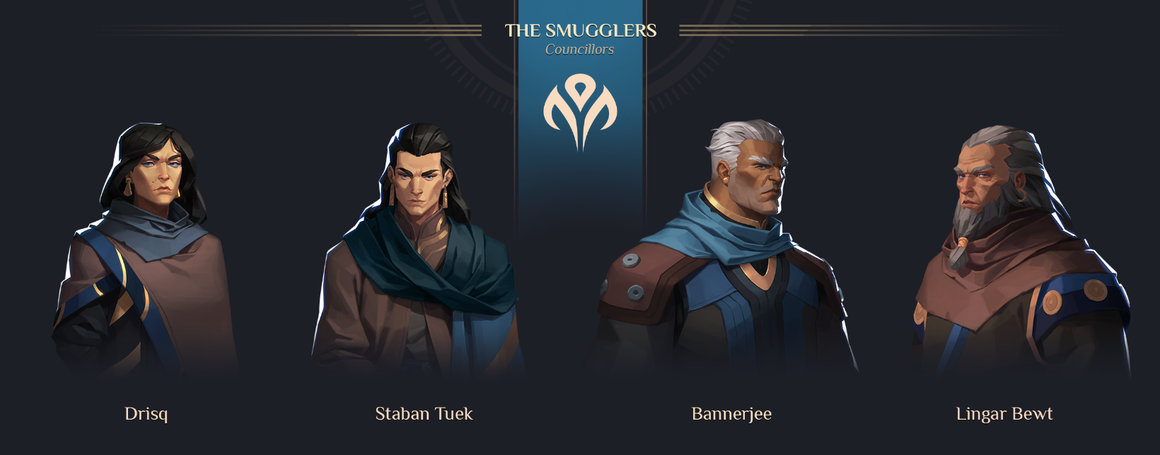 Cette faction sera menée par Esmar Tuek, qui a pour ambition de mener les Contrebandiers au sein-même du Landsraad et d’en égaler les maisons séculaires. Pour ce faire, il sera épaulé par Bannerjee, Drisq, Lingar Bewt et son propre fils, Saban Tuek.