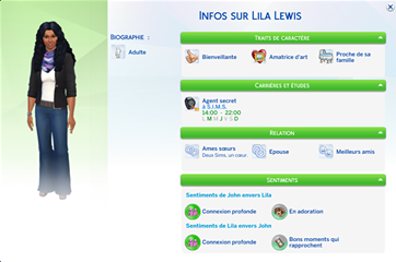 « Cela vous est-il déjà arrivé de chercher des informations sur les autres Sims dans la vie de votre Sim, et de tomber sur une immense info-bulle allant du haut de votre écran jusqu’en bas ? Nous oui, et nous n’étions pas satisfaits de cette situation. Il devait forcément y avoir un moyen plus pratique ! … Et le voici ! Découvrez : les profils ! Dans le panneau Relations, vous pouvez désormais cliquer sur le portrait d’un Sim et sélectionner « Ouvrir le profil » pour avoir un résumé complet de toutes les informations que le Sim actif connait à propos de ce Sim. Cela inclut même ces fantastiques nouveaux sentiments dont tout le monde parle ! »