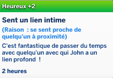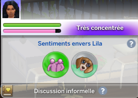 Vous pouvez voir les sentiments qui se sont formés entre des Sims à deux endroits. Lorsque vous discutez avec un autre Sim, cliquez sur le carnet couvert de cœurs qui apparaît dans l’IU sociale en haut de votre écran. Sinon, vous pouvez aussi voir les sentiments entre deux Sims à tout moment dans le nouveau profil du panneau Relations. Lisez la suite pour obtenir plus d’informations sur ce nouveau profil… »