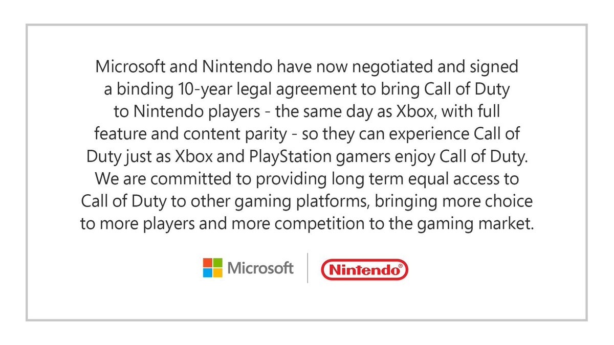 Alors que la bataille pour racheter Activision-Blizzard dure depuis des mois, Microsoft vient de sortir une arme de taille : rendre disponibles toutes les futures sorties Call of Duty sur les dix années à venir sur les plateformes de Nintendo. Et ça n’est pas une promesse, mais bel et bien un contrat signé qui a été présenté ce matin à la Commission Européenne.