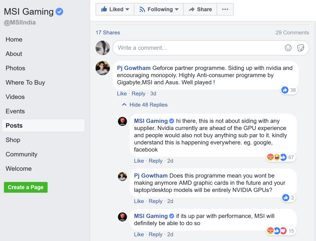 MSI, gros constructeur gaming s’il en est, a été la cible sur Facebook de plusieurs commentaires, accusant notamment l’entreprise taïwannaise de comploter avec Nvidia – le choix des mots ayant ici son importance. Le community manager de la page a finalement répondu, avec le commentaire suivant : « Cela n’a rien à voir avec s’allier au fournisseur. Nvidia a en ce moment les meilleurs GPU, et les gens ne veulent pas acheter quelque chose de médiocre« . Le commentaire a depuis été retiré, mais nos confrères de Forbes ont pu en faire une capture d’écran :