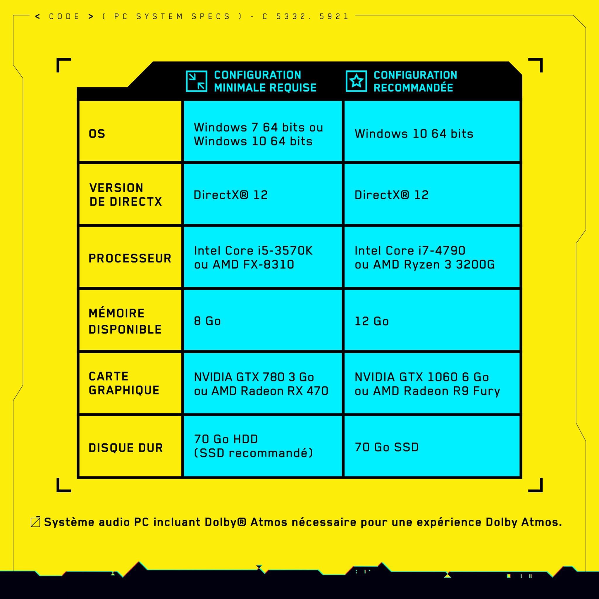 Très attendues, les configurations minimales et conseillées ont enfin été dévoilée ! On s’étonnera avec plaisir du minimum requis car, malgré sa beauté apparente et ses nombreuses fonctionnalités, Cyberpunk 2077 tournera aisément sur les machines les plus humbles. Et pour ceux adeptes de ray tracing et autres folies visuelles, on retrouve encore une fois des specs relativement peu exigeantes, même si un meilleur matériel permettra de profiter à fond de Night City.