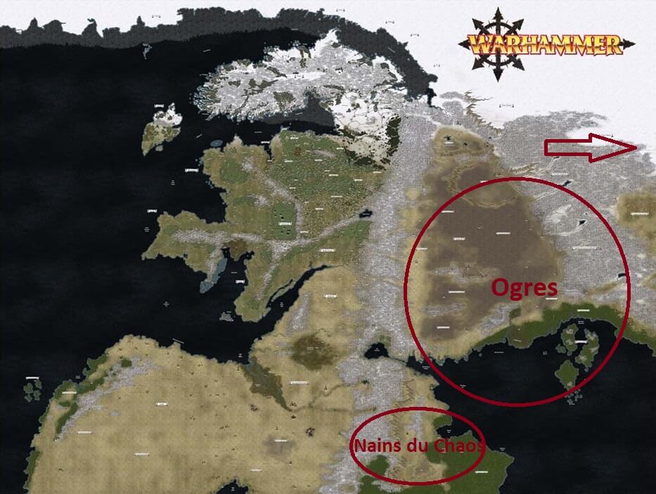 Il y a une grosse erreur sur votre map, les Nains du Chaos sont situés dans la moitié nord des Terres Sombres (au-dessus du cercle que vous avez attribué aux Ogres), et les Ogres, eux, dans les montagnes à l’est de ces Terres Sombre. La zone que vous attribuez aux Nains du Chaos est déjà traitée dans TWW2, par ailleurs (elle est occupée principalement par des Rois des Tombes et des Hommes-Lézards).