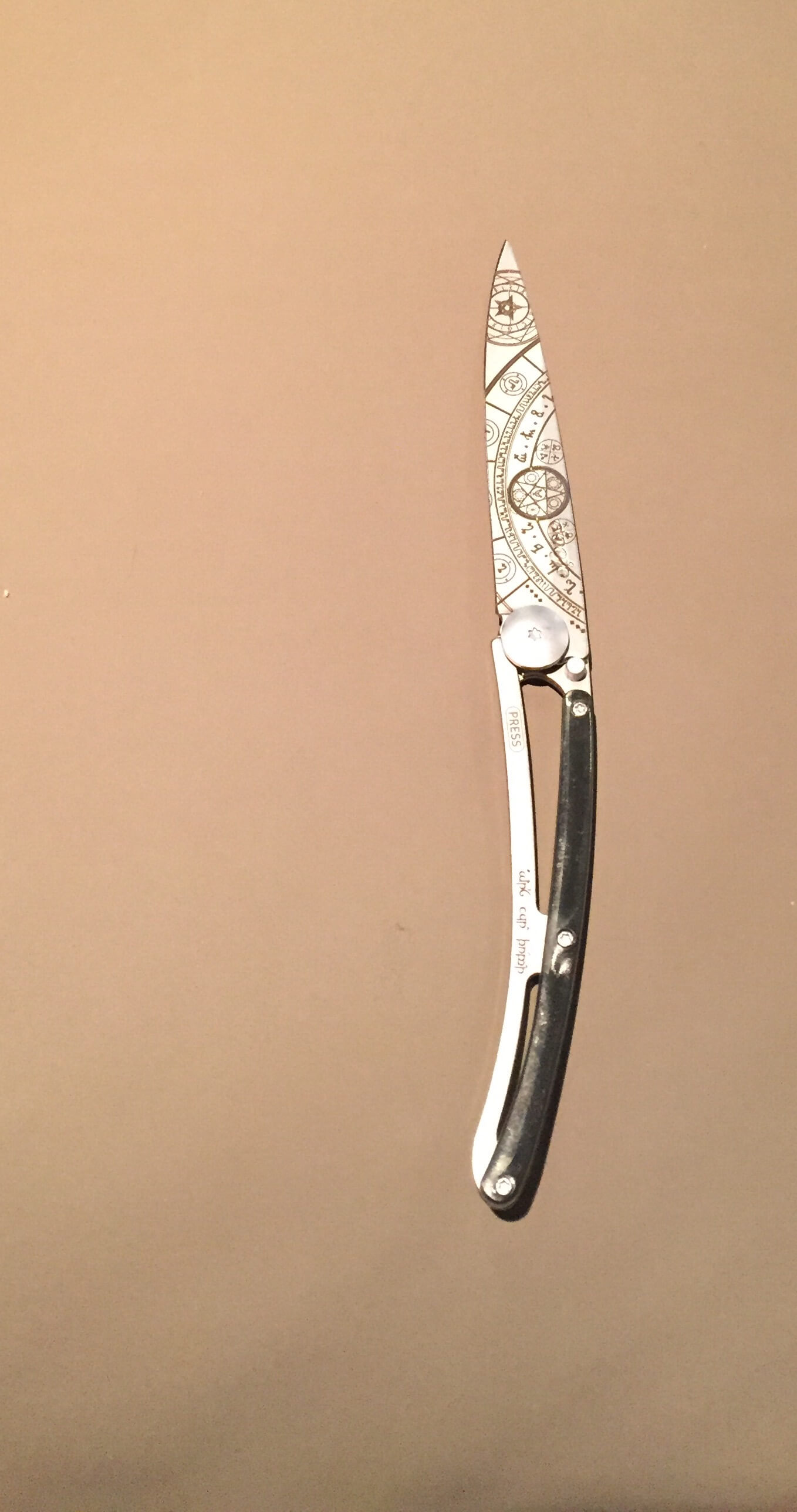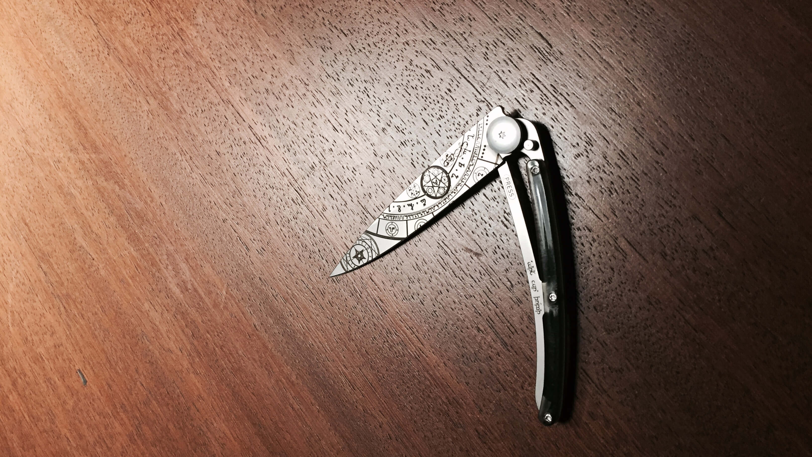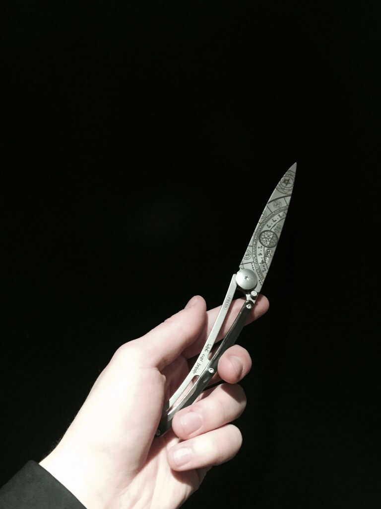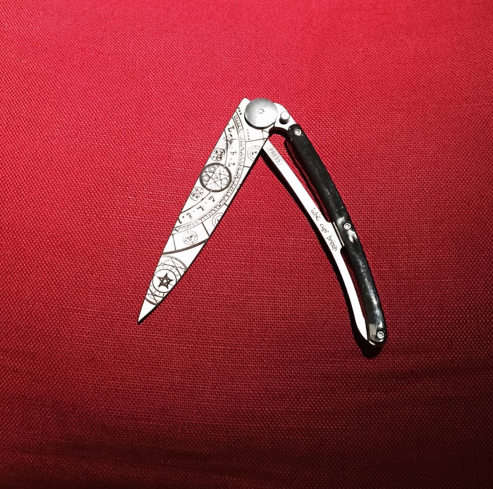 Nous avons pu en recevoir un exemplaire et comme vous pouvez le constater sur les photos, ça claque pas mal. La première chose qui frappe est, bien sûr, le « tatouage« . Le site très pratique propose une multitude de motifs à appliquer sur la lame, allant de symboles ésotériques complexes à de magnifiques dessins. Il y en a à peu près pour tous les choix, et c’est assez dur de se décider.