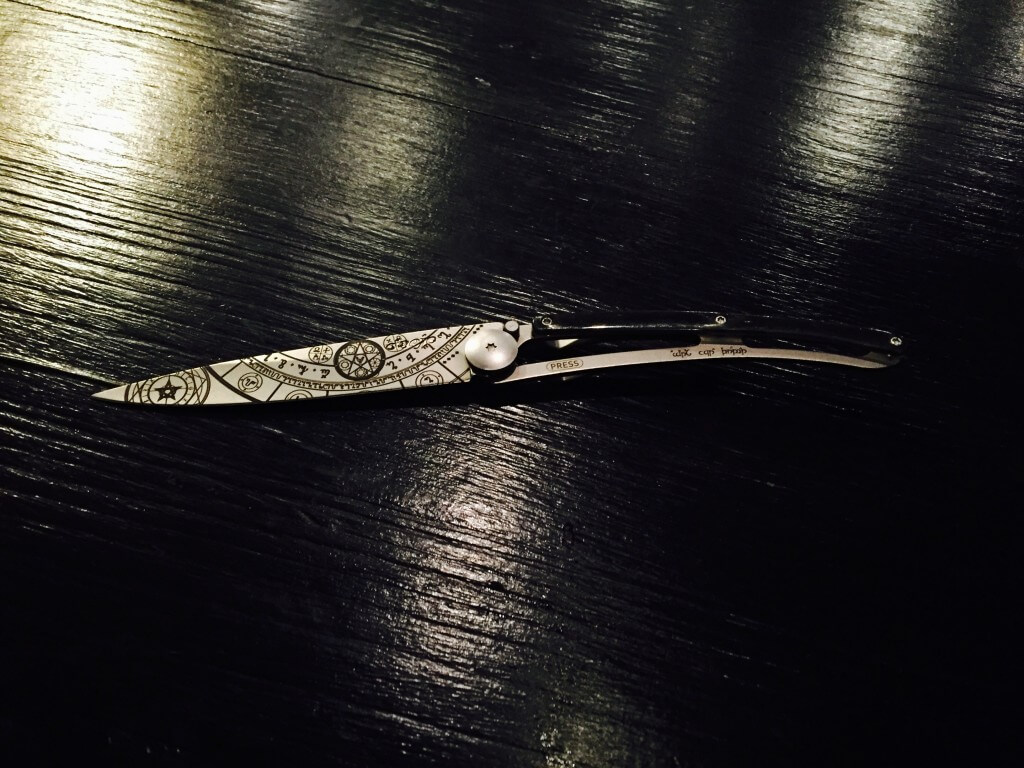 Nous avons pu en recevoir un exemplaire et comme vous pouvez le constater sur les photos, ça claque pas mal. La première chose qui frappe est, bien sûr, le « tatouage« . Le site très pratique propose une multitude de motifs à appliquer sur la lame, allant de symboles ésotériques complexes à de magnifiques dessins. Il y en a à peu près pour tous les choix, et c’est assez dur de se décider.