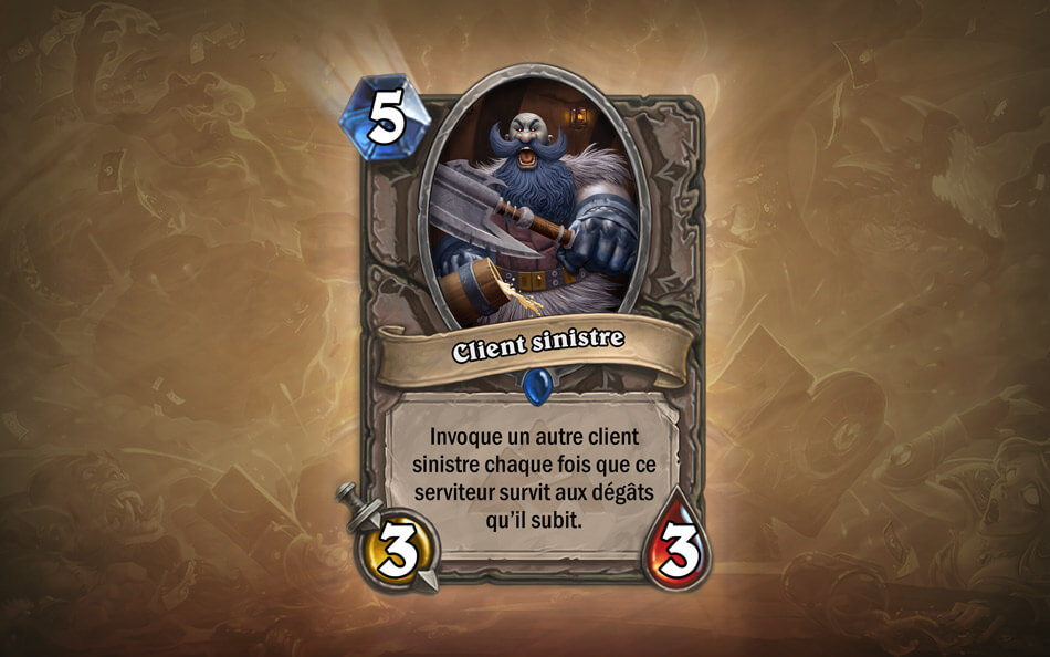 Nous voici avec une carte valant 5 cristaux de mana dont l’effet est le suivant : Invoque un autre client sinistre quand cette carte survit aux dégâts qu’il subit.