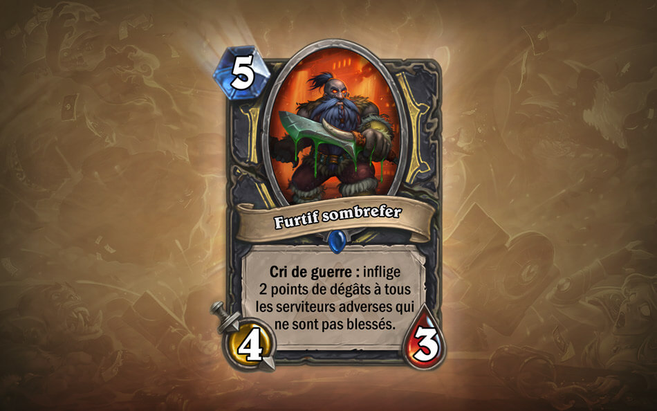 Le cri de guerre : inflige deux points de dégâts à tous les serviteurs adverses n’étant pas blessés, est tout simplement dévastateur contre des decks misant sur la pose de multiples serviteurs à faible coût et donc à faibles valeurs. Et peut permettre un ou des trades sur des serviteurs adverses hors de portée de vos contrôles ou de vos serviteurs présents sur le plateau.