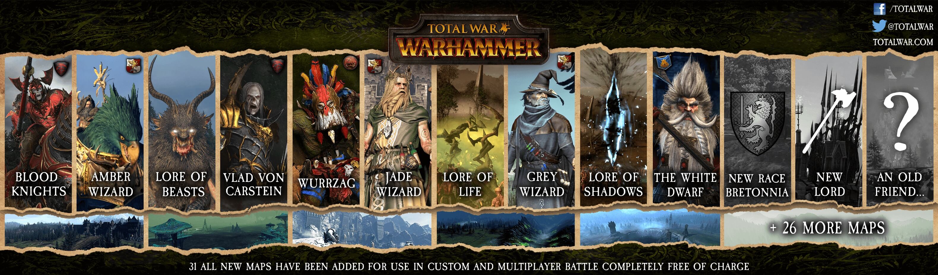 Un an après sa sortie, le jeu de Sega et Creative Assembly n’a pas chuté, bien au contraire. La Bretonnie a été ajoutée gratuitement, à l’occasion d’une nouvelle édition du jeu. Cette faction, attendue depuis longtemps, à offert un nouveau gameplay extrêmement intéressant en plus de renforcer une partie de la map qui était jusqu’à peu exploitée ; et pour continuer dans cette lancée, ce sont les mystérieux Elfes Sylvains qui ont aussi émergé de la forêt, dans un style qui cassait avec les armées précédentes. Les Hommes-Bêtes ont été la première faction ajoutée après la sortie du jeu, signalant un déferlement de violence dans le Vieux Monde, et donc des campagnes encore plus fun.