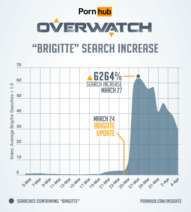 Il a noté que « Overwatch » était le treizième terme de recherche en 2017 sur PornHub, et étonnamment devant la douce Leah Gotti ! La popularité du site a augmenté de 321% en 2016, au lancement de la bêta publique ; si la popularité d’Overwatch a depuis baissé, elle est toujours bien plus grande que celle, par exemple de League of Legends.