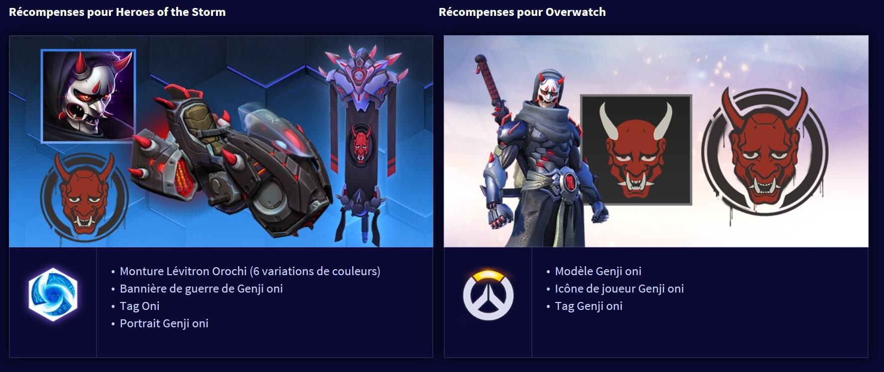Actuellement en cours, l’événement Oni Genji avait été déployé il y a quelques mois, et permet de gagner les éléments suivants : skin Oni Genji, icône de profil et tag. Il vous faudra pour cela jouer cinq matchs sur Heroes of the Storm, et cela marche même en versus IA !
