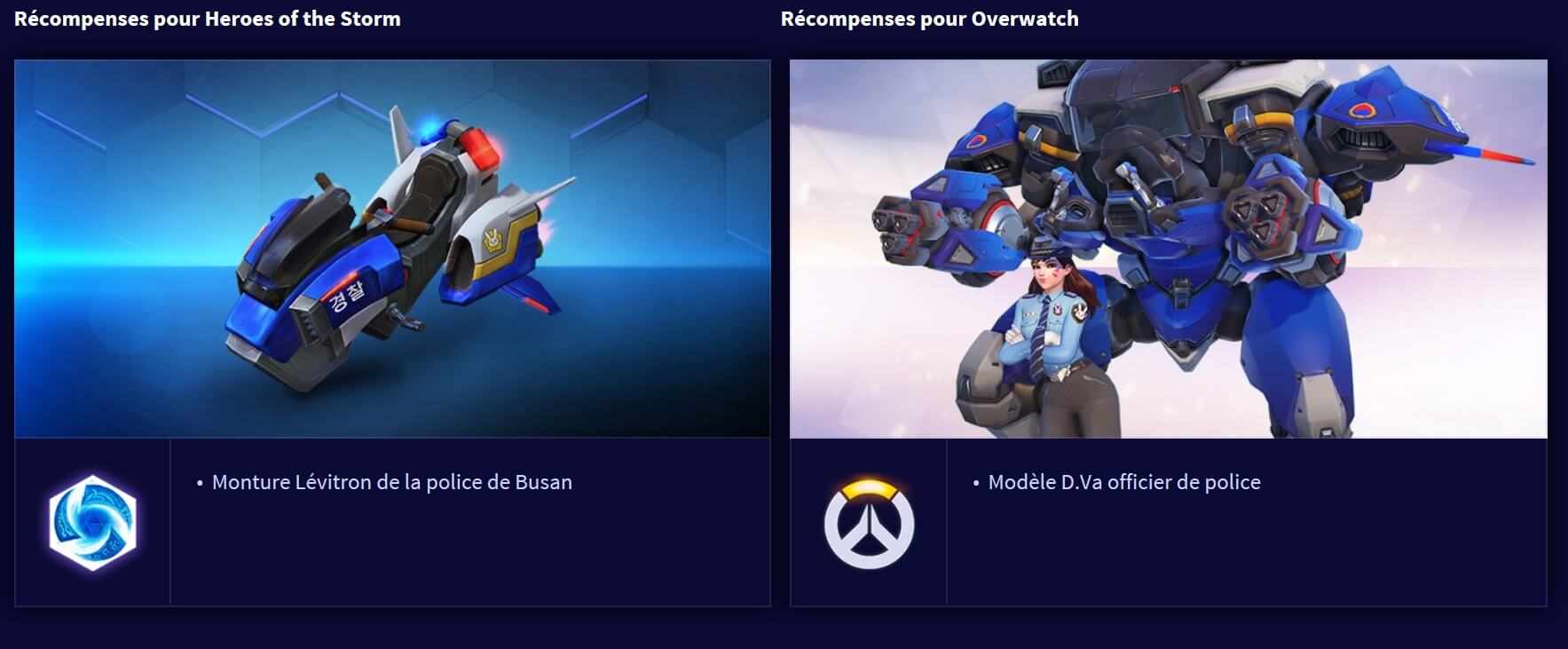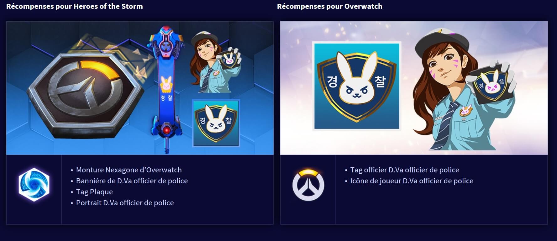 Des récompenses un peu moins excitantes cette fois-ci : un tag et une icône Officier D.Va – néanmoins, il y a aussi beaucoup d’autres récompenses relatives à Heroes, cela vaut quand même le coup.