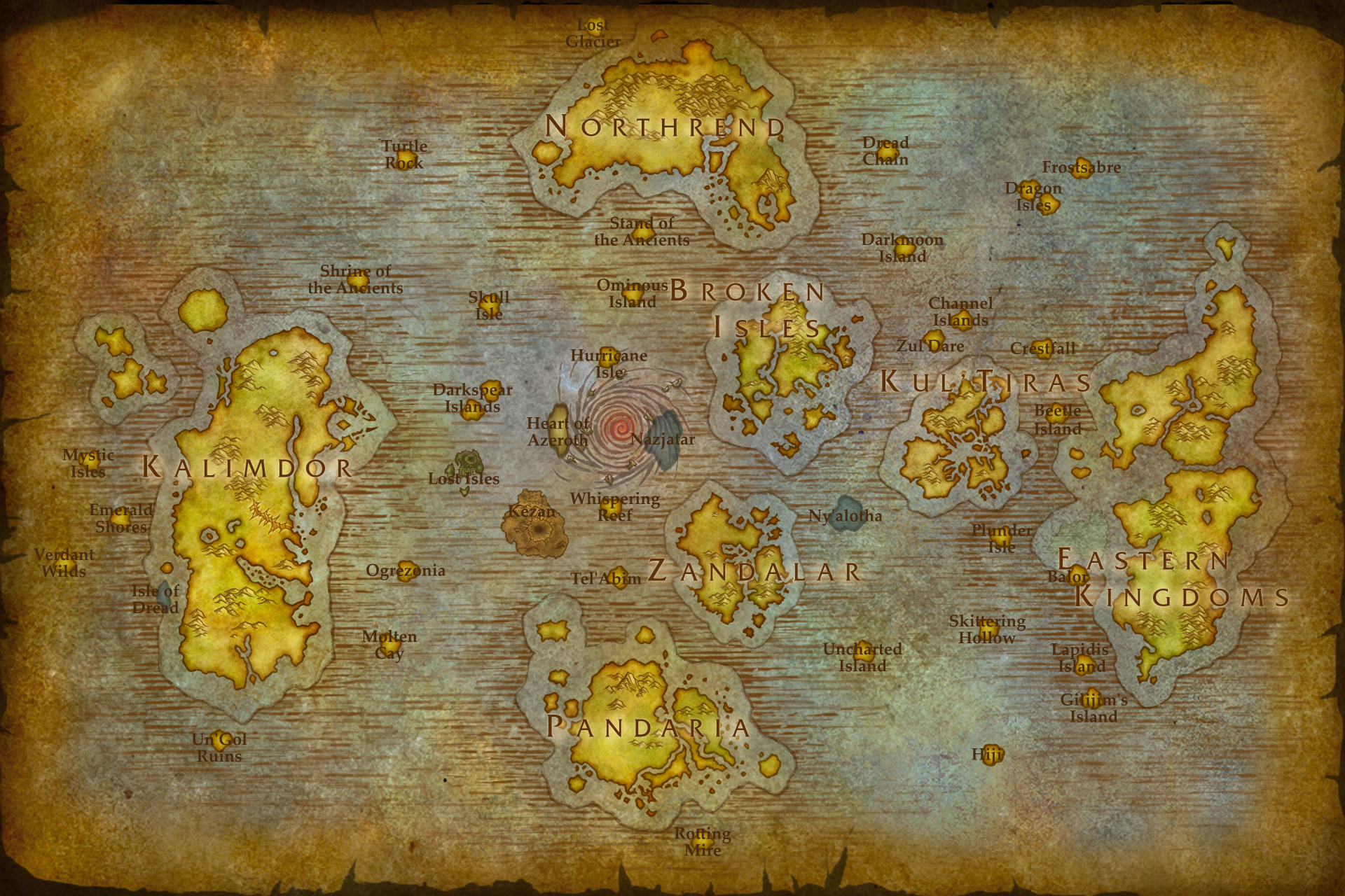 Dans l’imaginaire commun, plusieurs territoires des Mers du Sud offriraient un excellent cadre pour une extension ou des mises à jour majeures. Il est admis que les Mers du Sud s’étendent du Maelström méridional au nord de la Pandarie ; cette définition peut être plus ou moins nuancée, mais l’idée est qu’il y a un tas d’îles attrayantes à explorer. Ainsi, Kul Tiras et Zandalar ont été un premier pas dans cette direction.