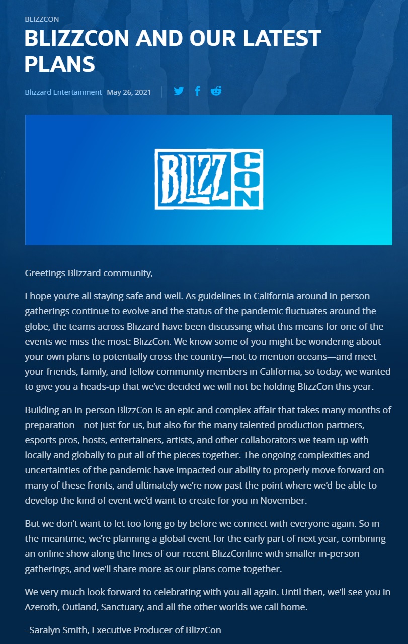 Blizzard vient de publier un message officiel concernant sa grande messe annuelle, la BlizzCon. Habituellement tenue en Californie, elle avait été annulée l’année dernière suite à la situation sanitaire liée au Covid-19. Concernant 2021, Blizzard a expliqué que la BlizzCon de novembre ne pourrait pas non plus se tenir : une telle organisation se fait des mois à l’avance, et alors que les restrictions sanitaires commencent tout juste à être levées, il aurait été trop incertain d’annoncer l’événement.