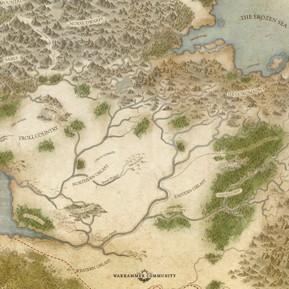 Là où c’est intéressant, c’est que cette map paraît extrêmement précise avec des vallées, des forêts, des escarpements… bref, cela pourrait parfaitement être intégré à un RPG, là où l’ancienne map était basique. Et dans le cas présent, Kislev semble afficher des étendues boisées qui n’étaient pas là auparavant, ce qui pourrait indiquer une temporalité antérieure à ce qu’on connaissait. Des experts loristiques, sur divers forums, ont également noté que le premier teasing semblait mettre en avant le Solland, province impériale ayant été anéantie lors de l’Âge des Trois Empereurs. Il est donc possible que Games Workshop souhaite « agrandir » la surface exploitable de son monde pour y caser un maximum d’histoires et c’est une excellente chose. Comparativement, la nouvelle Kislev semble encore plus détaillée que le Vieux Monde d’il y a encore cinq ans !