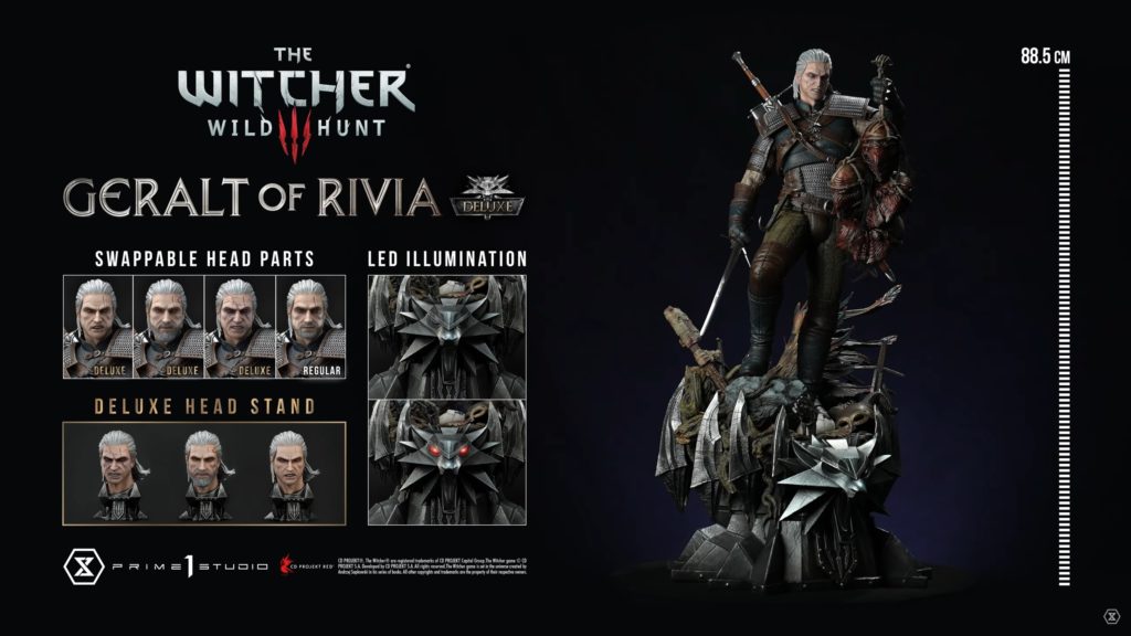 Le prix est certes intimidant, mais cette « Geralt of Rivia Deluxe Version » comporte quand même quelques arguments de poids : la main droite tient la célèbre épée en argent, crainte de maints monstres, tandis que la gauche arbore avec nonchalance un trio de tête de harpies – ça leur apprendra à faire les malines en planant. Notre sorceleur préféré revêt également l’indémodable armure de Kaer Morhen, et est sis sur un magnifique socle qui s’illumine à l’aide de LED.