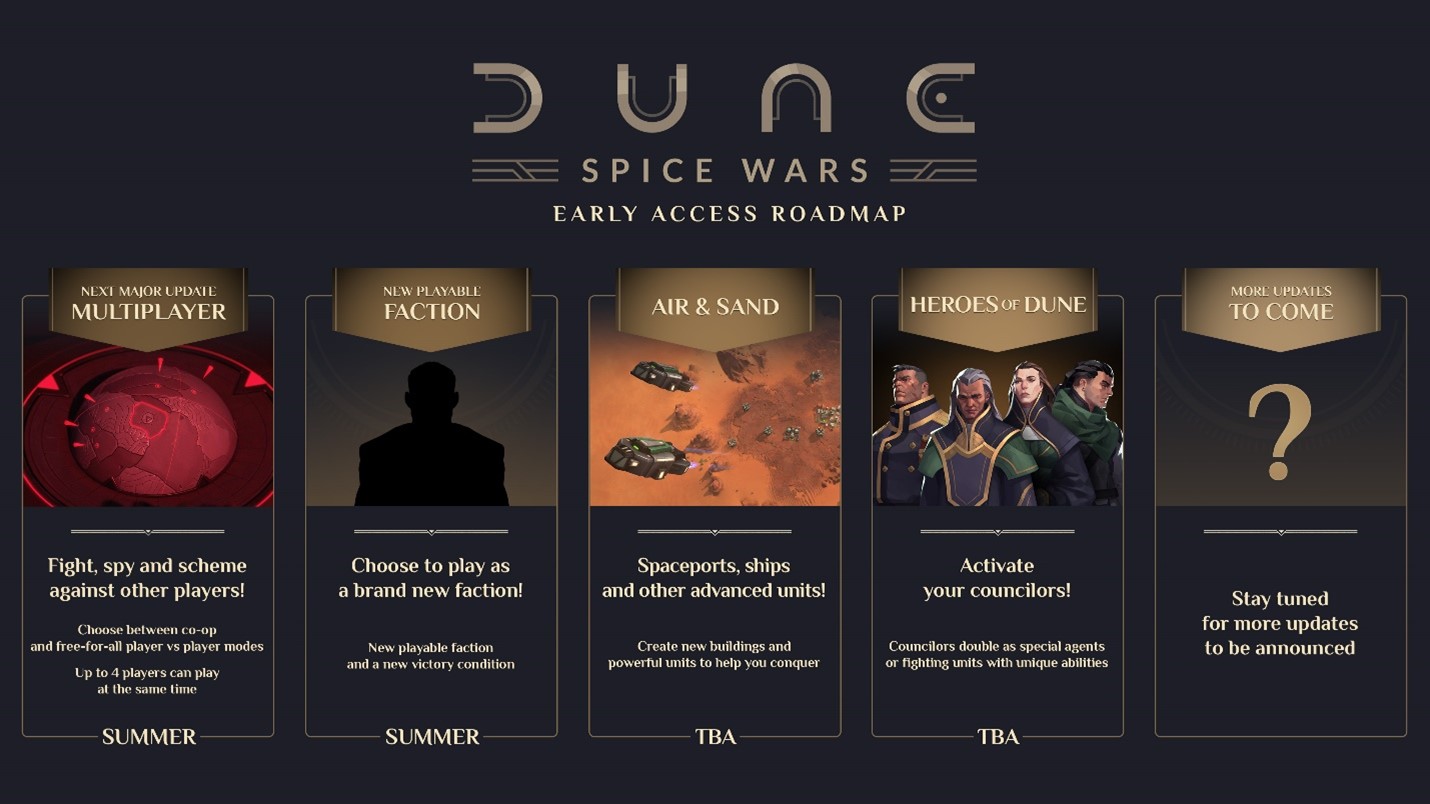 En early access depuis un mois, Dune : Spice Wars a déjà eu sont lot de critiques positives – vous pouvez en découvrir plus dans notre preview dédiée. Le développeur Shiro Games compte bien aller encore plus loin, et a dévoilé aujourd’hui la première roadmap du jeu.