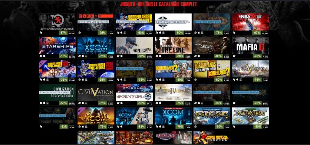Décidément, Valve en veux à votre porte-monnaie ! Steam revient avec des soldes hallucinantes jsqu’au 23 mars, pour fêter les 10 ans du studio 2K ! Parmi les jeux qui risquent de vous faire succomber, on peut trouver :