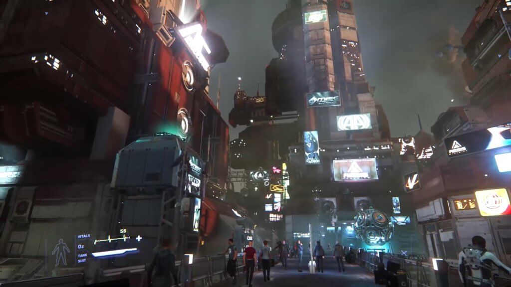Lors de la CitizenCon 2947, c’est Chris Roberts en personne qui a dévoilé à quoi ressembleront les villes du jeu, en particulier l’Area 18 ; on y découvre des cités titanesques et lumineuses, à la sauce de Blade Runner ou du futur Cyberpunk 2077 de CD Projekt ; des tours sombres sur lesquelles sont accrochés des panneaux publicitaires lumineux, des nuages de fumée entre lesquels serpentent des vaisseaux… clairement, l’immersion est au rendez-vous ! Les villes seront générées de manière procédurale, mais CGI s’attache à développer un maximum d’assets diversifiés afin que deux villes soient totalement différentes l’une de l’autre, avec chacune une personnalité propre. Par ailleurs, la grande majorité des bâtiments sera explorable, et ne servira donc pas que de simple remplissage de façade.
