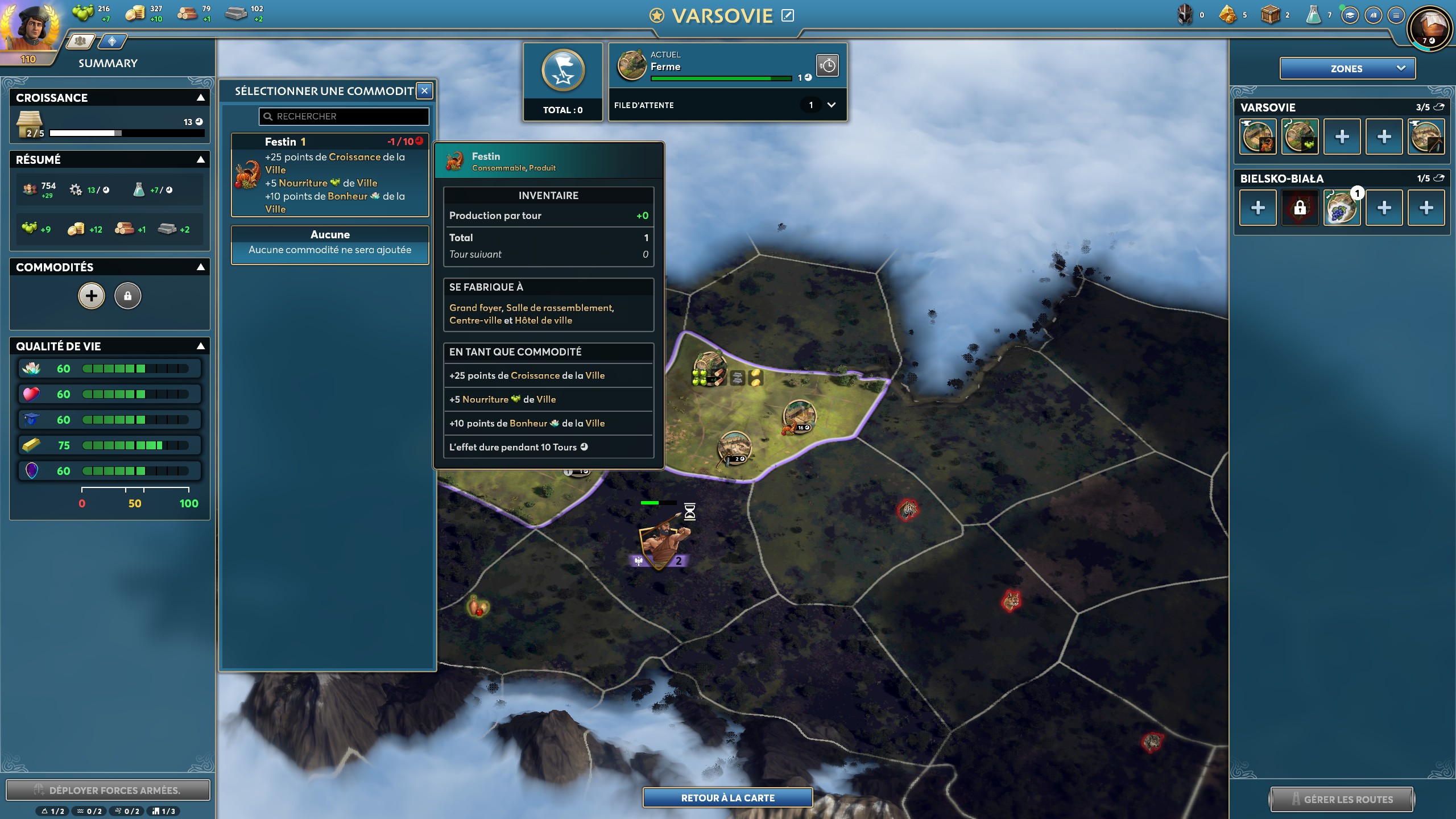 Chaque bâtiment construit dans une ville dispose d’une représentation sur la carte, et l’agencement doit être stratégique. Par exemple, le Puits donnant un bonus de production de nourriture à toute la région, il est conseillé de faire des Fermes dans les zones attenantes ; une région contenant une Carrière sera plus propice à y installer d’autres moyens de production. Les Triomphes (équivalent des Merveilles de Civilization) prennent une région entière, il sera donc judicieux d’en sélectionner une n’offrant que deux zones. Cette liberté est certes déstabilisante au début, mais elle donne à un 4X une dimension de city builder bienvenue, qui permet une meilleure planification stratégique, et donc de meilleurs rendements. Et s’il y a bien une chose qu’on aime dans ce genre de jeux, c’est d’avoir les plus hauts rendements possibles !