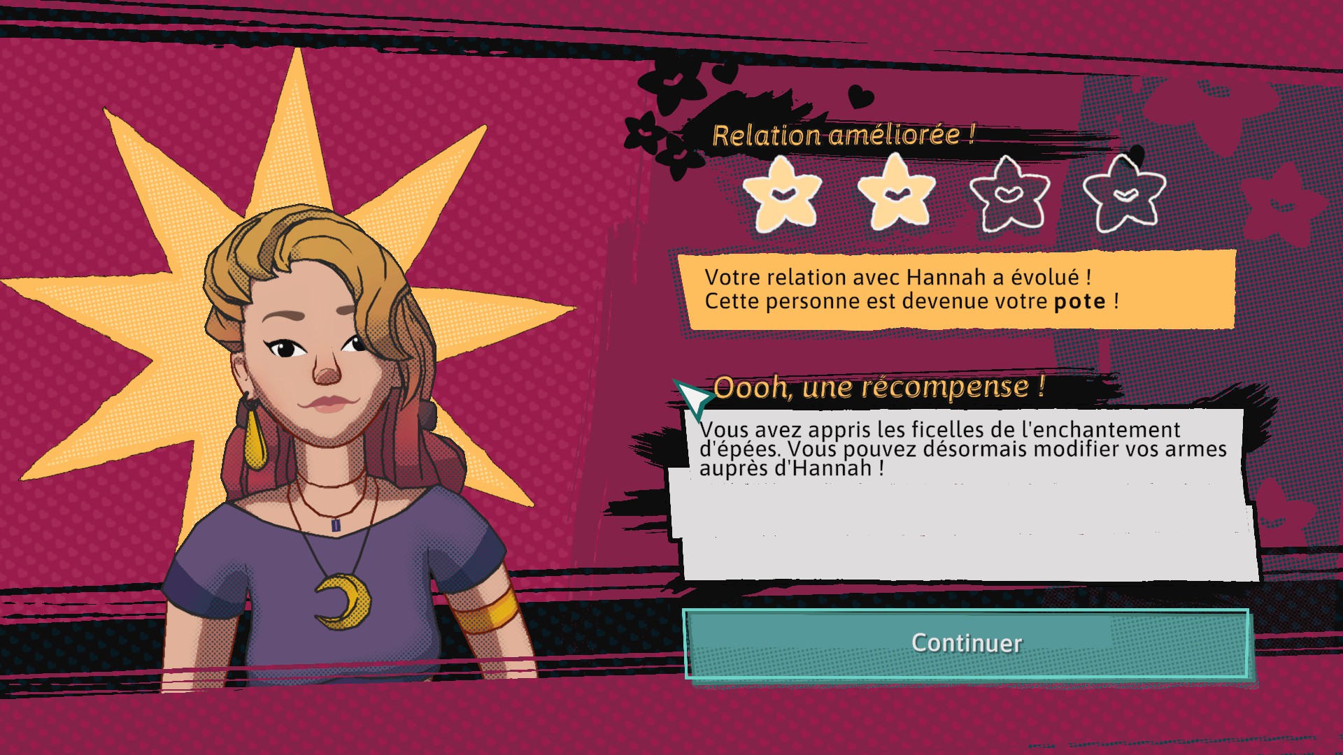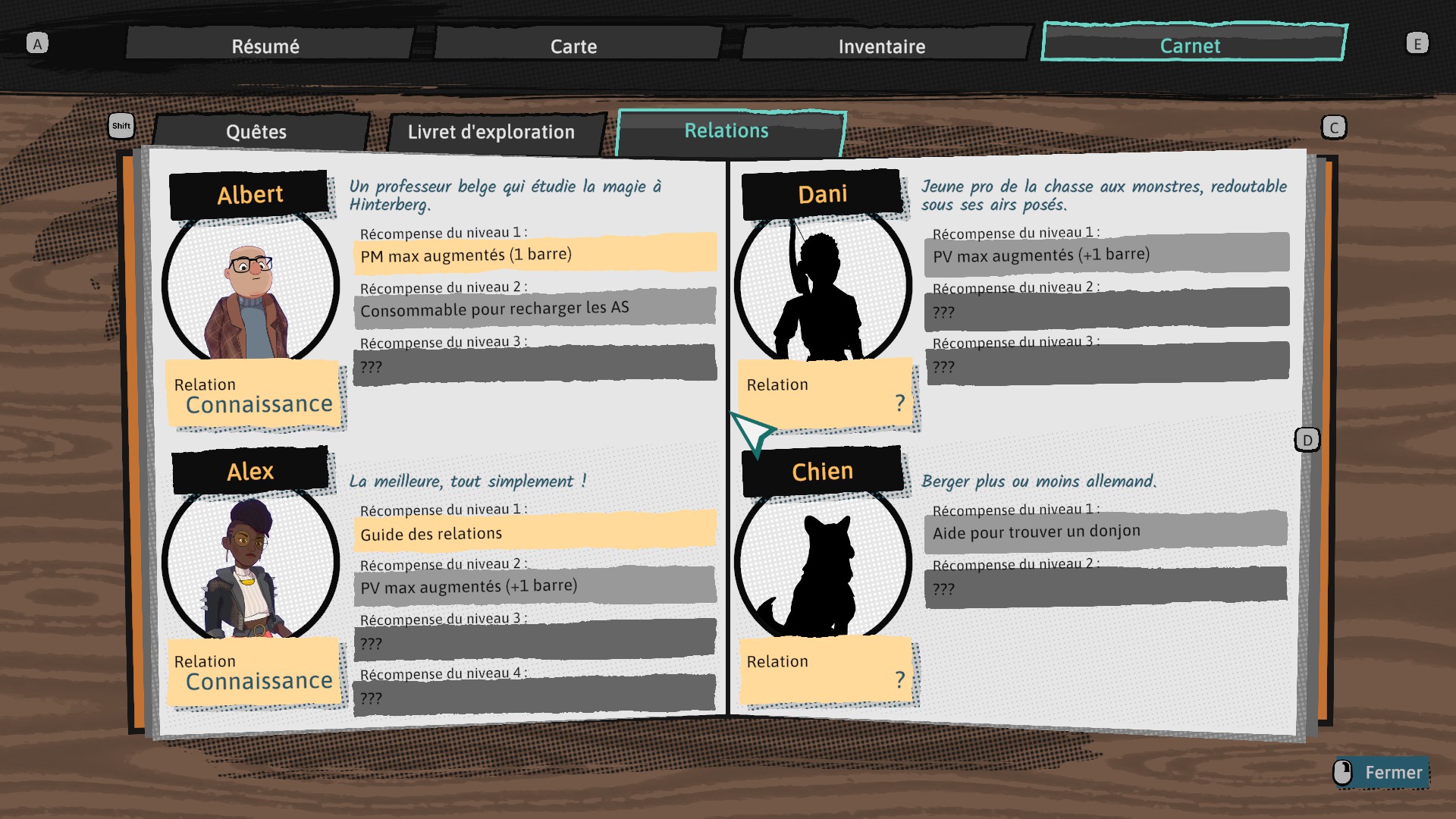 Tout en vous baladant durant l’après-midi ou durant la soirée, vous avez la possibilité de rencontrer de nouveaux amis ou d’approfondir vos connaissances. Celles-ci ont un intérêt tout particulier puisque chaque évolution d’amitié vous apportera des bonus non-négligeables. Afin de vous y retrouver facilement et d’orienter vos attaches selon vos souhaits, le carnet des relations est votre allié. Celui-ci vous permet de suivre chacun des statuts avec vos amis, mais également de connaître les récompenses liées à chacun d’eux ! Celles-ci sont diverses et variées, allant du don de Hinterbiff à l’ajout d’une barre de PV et bien d’autres que nous nous gardons de vous spoiler…