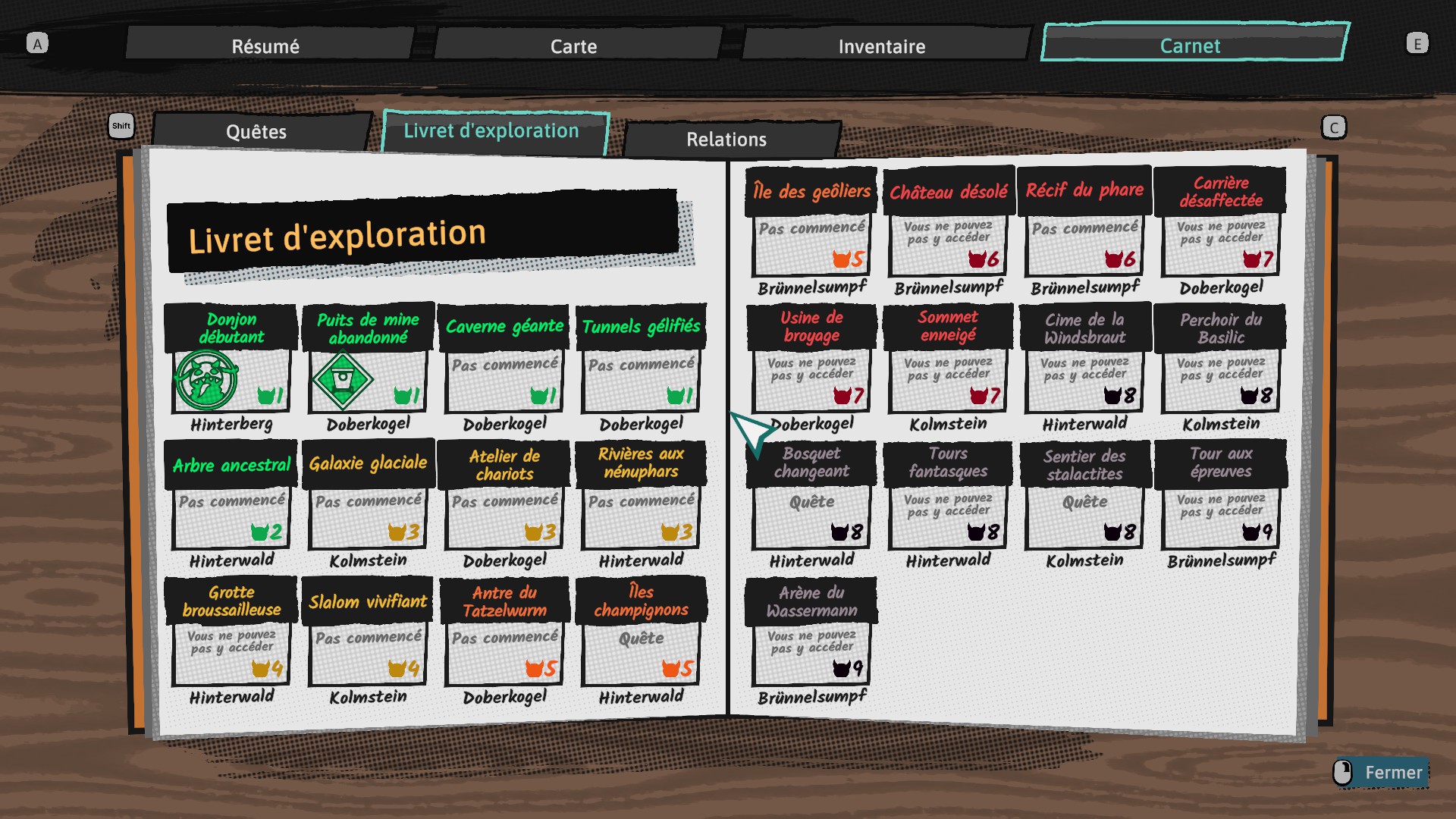 25 donjons sont apparus du jour au lendemain dans la région d’Hinterberg, répartis dans quatre zones (Doberkogel, Hinterwald, Kolmstein et Brünnelsumpf). Chacun d’entre eux s’est vu attribuer un niveau de difficulté par les autorités locales et est indiqué sur votre carnet ou bien sur les panneaux dans la zone. Il vous sera nécessaire d’avoir le niveau d’équipement requis afin de pouvoir en venir à bout, pour ce faire vous avez accès à la boutique Gear & More en ville, ou bien grâce aux loots au fil de vos aventures.