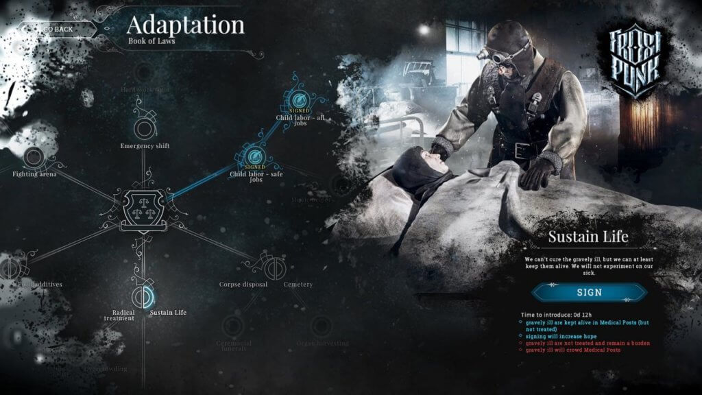 C’est là que rentrent véritablement en compte les lois parmi lesquelles vous devrez faire des choix parfois cornéliens : envoyer les enfants au travail ou dans un abri ? Laisser tomber les malades graves ou essayer de les soigner quoi qu’il en coûte ? Ce sera a vous de décider ce qui sera le mieux pour votre communauté. En parallèle, il vous faudra envoyer des expéditions dans l’extérieur gelé pour ramener des ressources ou d’autres survivants. Mais c’est quoi le but de tout ça ? Se préparer pour une grande tempête de froid qui approche, afin d’y survivre. La préparation est donc la clé, mais il faudra composer avec de nombreux problèmes sur le chemin.