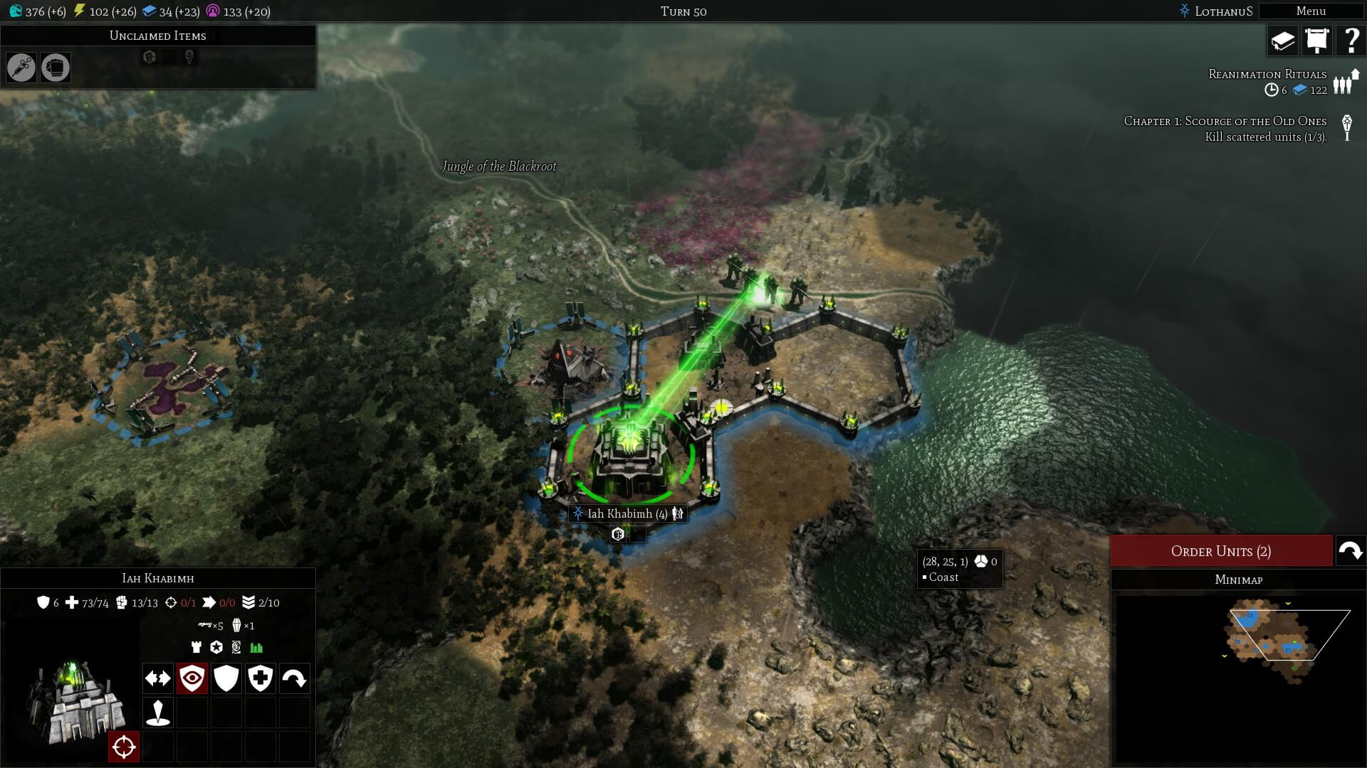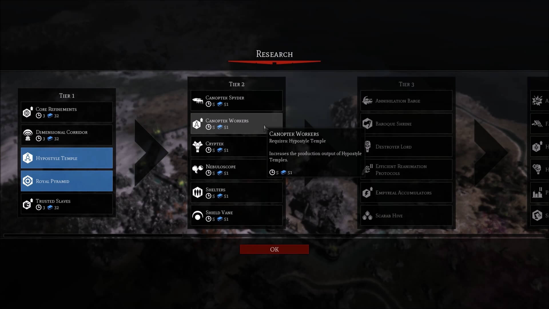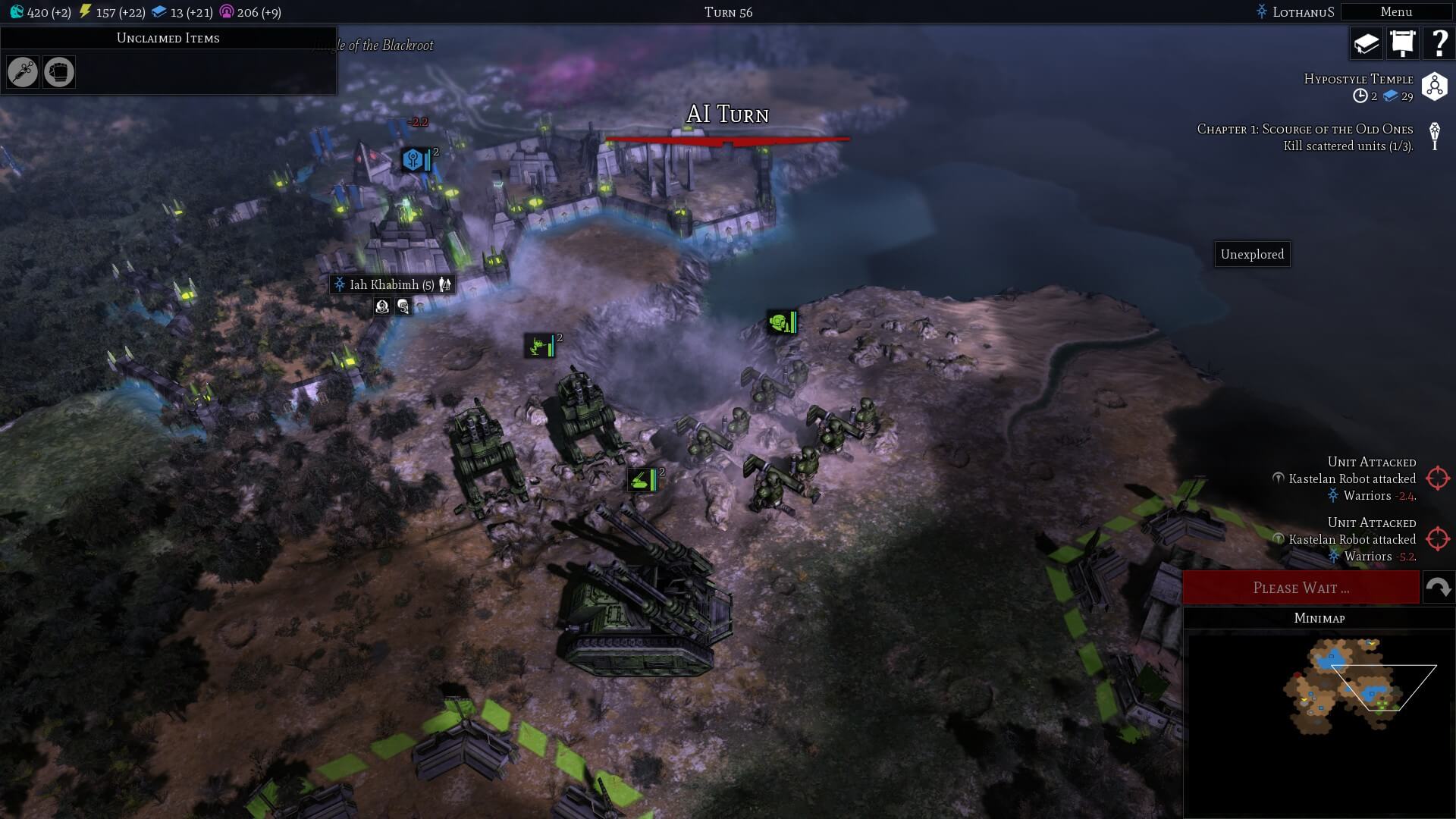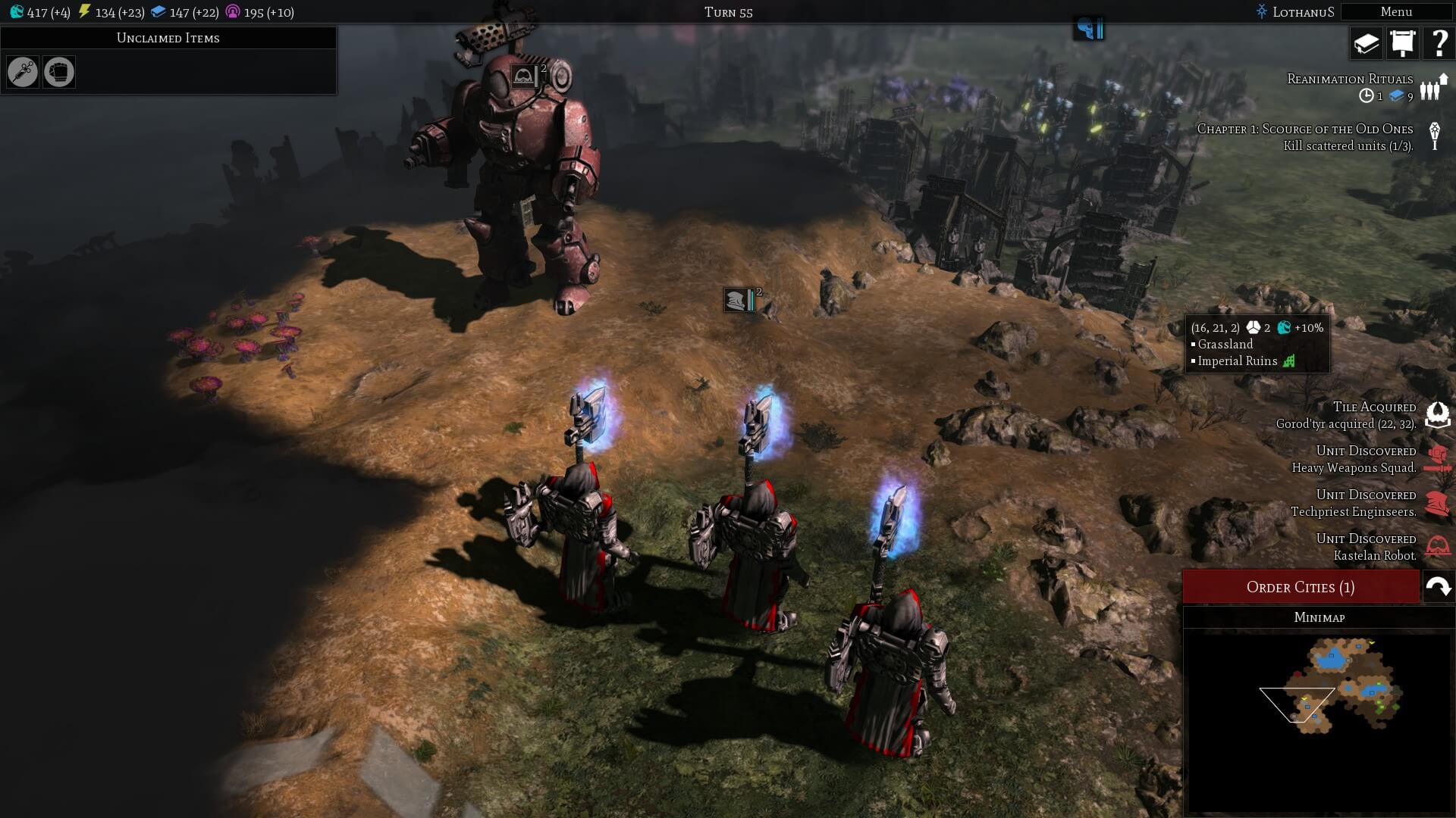 Au niveau des combats, fait assez intéressant, votre unité tirera automatiquement à chaque tour sur l’adversaire le plus proche ; c’est assez déroutant au premier abord mais illustre bien l’aspect agressif de Warhammer 40,000. Certaines unités disposent de capacités spéciales, comme les héros que vous pourrez produire : chapelain, seigneur nécron… Les adversaires seront assez agressifs, alors n’attendez pas trop avant de produire vos premiers atouts ! Notez que les adversaires que vous rencontrerez en premier seront très probablement des « autochtones », comme des chiens kroots (arrivée des Tau en DLC ?) ou encore des Kastellans ou prêtres de la machine, fort indice de l’arrivée de l’Adeptus Mechanicus. J’ai d’ailleurs noté qu’à mon goût, les unités autochtones sont un peu trop puissantes et gênent l’avancée de vos plans militaires, quitte à faire l’impasse sur l’économie.