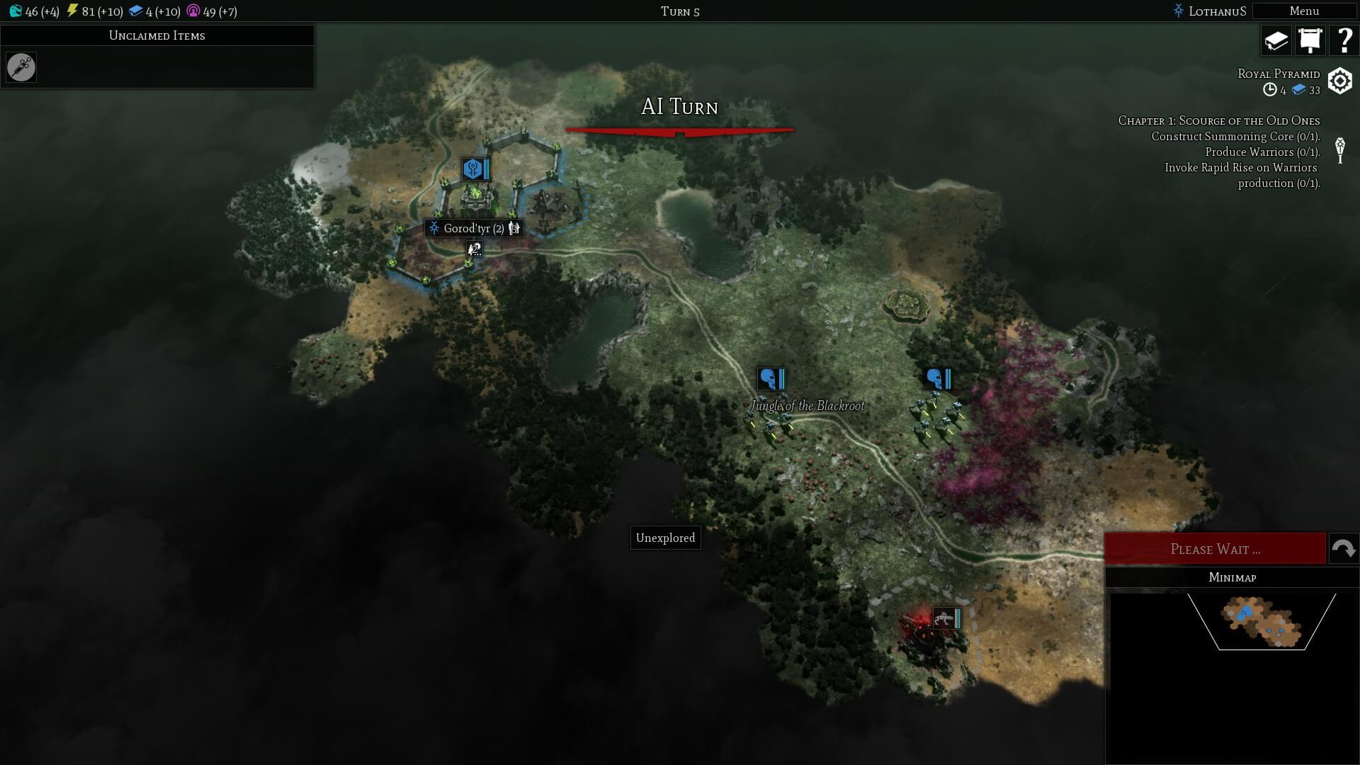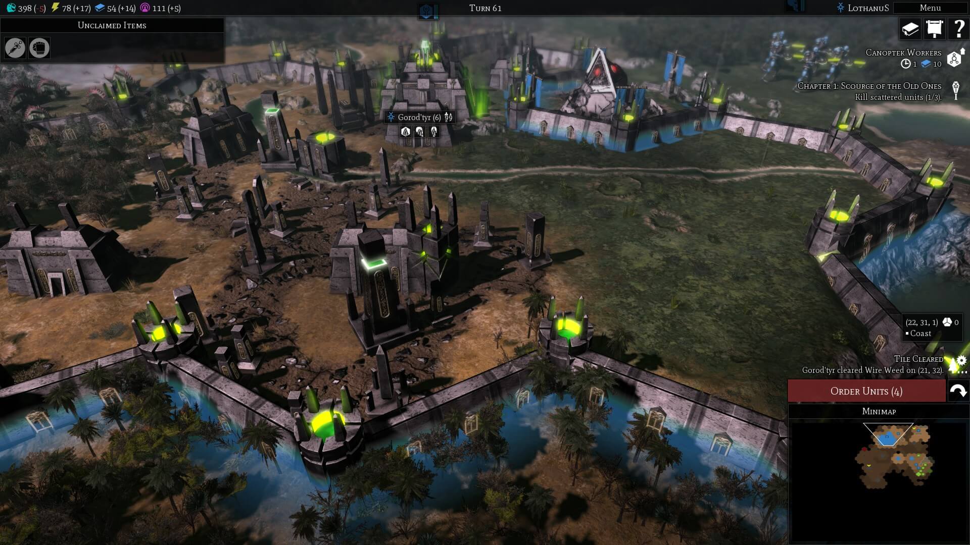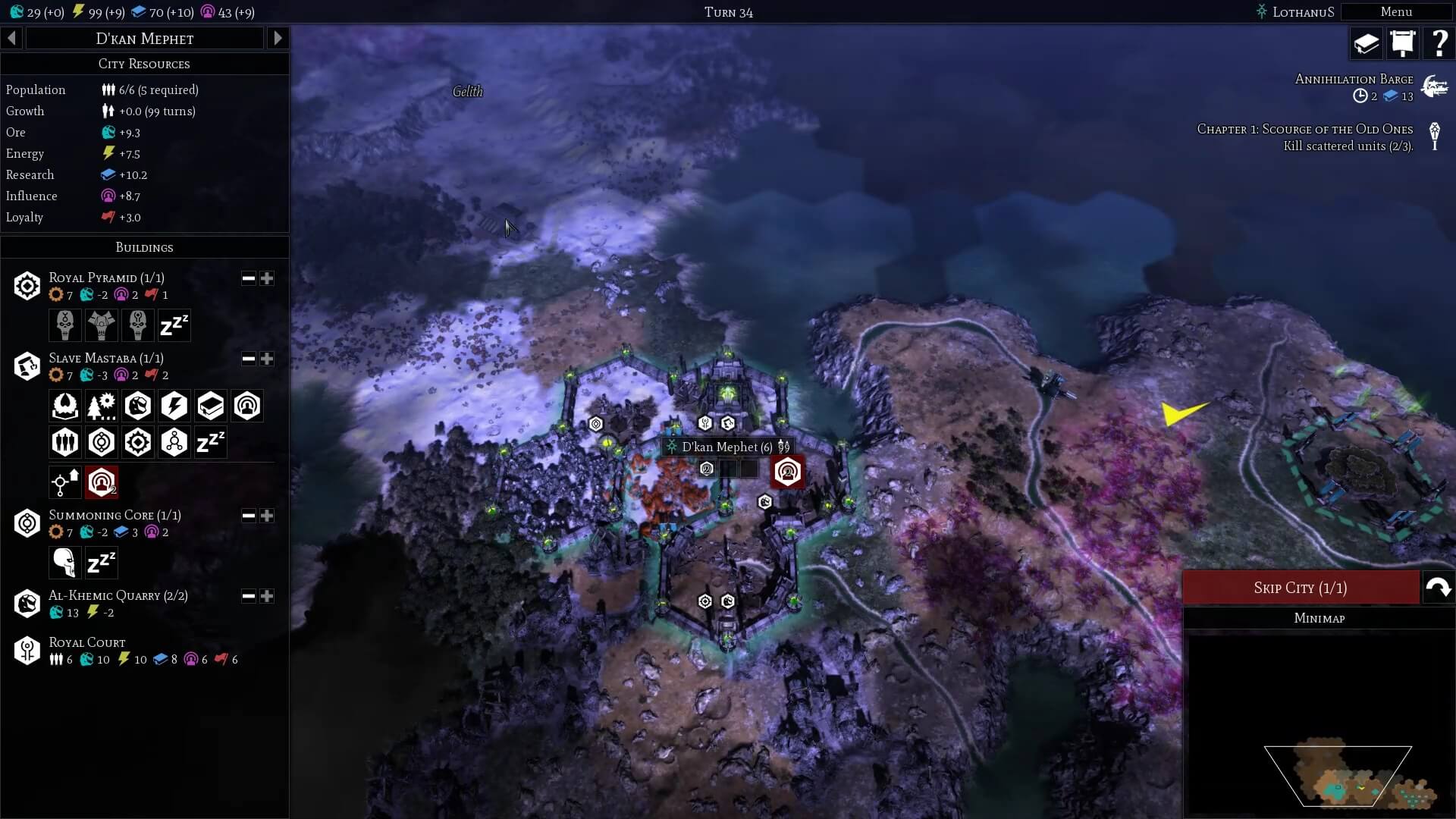 L’aspect « expansion » du jeu, de même que « exploitation », est assez différent de ce dont on à l’habitude. Chaque ville doit acquérire des tiles aux alentours avant de pouvoir construire dessus ; chaque tile incluse est protégée par un rempart assez stylé, ce qui montre plutôt bien l’agrandissement de la ville. Les ressources sont peu nombreuses (minerai/réquisition/nourriture, énergie, influence et points de recherche) mais devront être utilisées avec parcimonie pour avoir rapidement une armée de taille respectable.