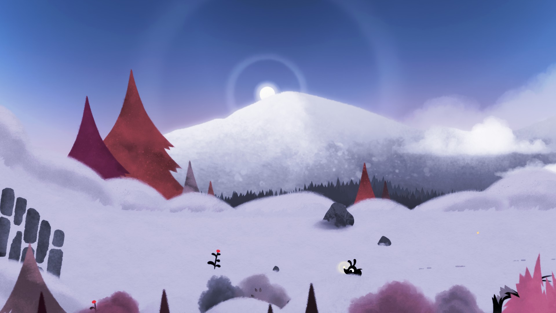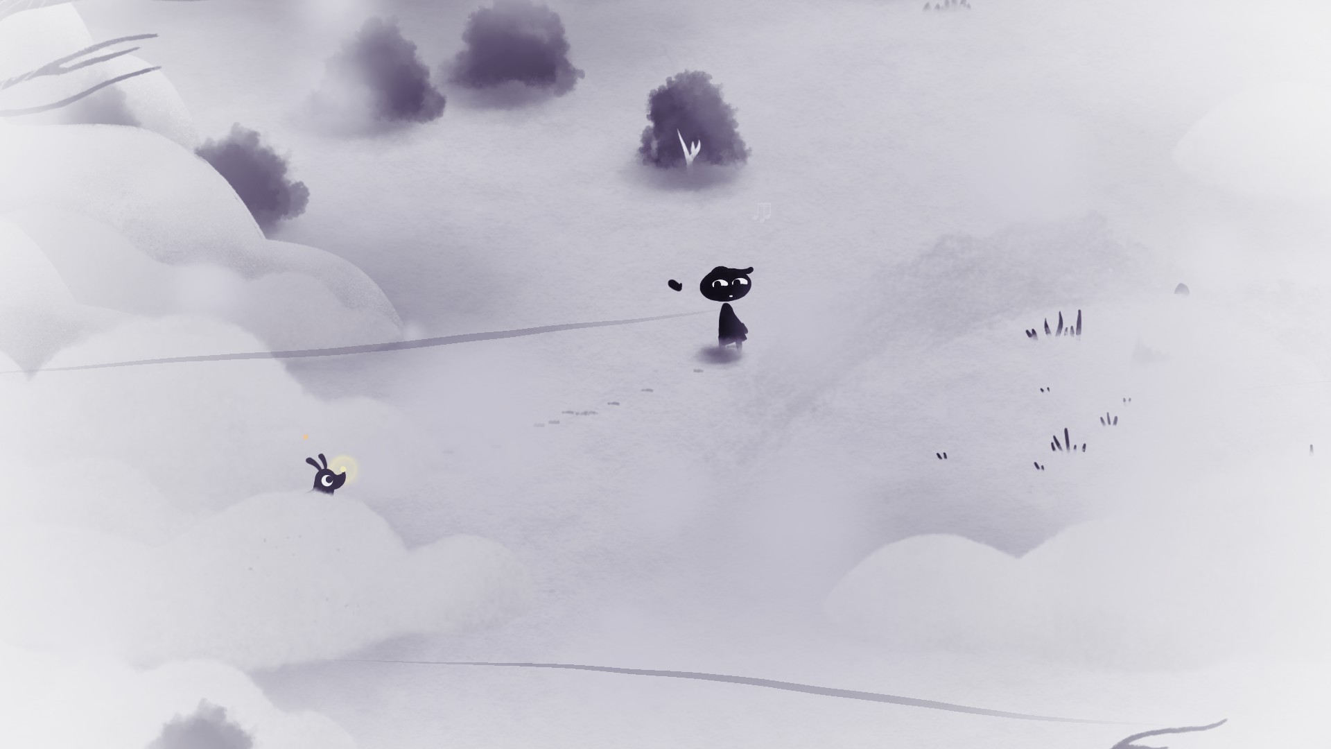 Et justement, en parlant de mélodie, ce qui frappe en jouant à Koira ce sont ses accords qui ponctuent notre aventure. Ceux-ci sont toujours très bien adaptés à la situation, que ce soit durant une folle glissade les oreilles au vent ou un cache-cache sous tension avec les chasseurs et leurs chiens. Parfois discrète, l’ambiance musicale et sonore nous enveloppe et nous encourage à poursuivre l’aventure – je dirais même qu’elle nous mène dans la bonne direction.