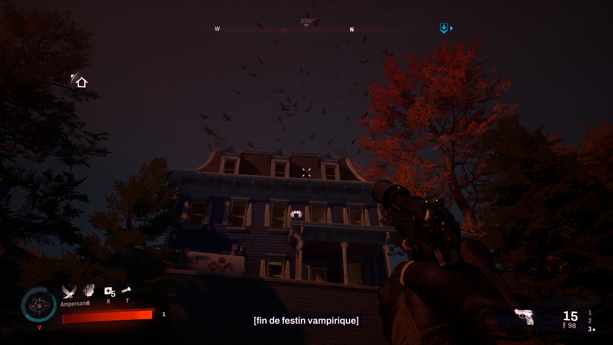J’ai trouvé Redfall assez vide pendant une minute ou deux… Et puis tout change. Il faut bien comprendre qu’Arkane n’a pas réalisé un beat’em all, mais quelque chose de plus subtil : les maisons abandonnées (jusqu’à ce qu’on s’y fasse prendre en embuscade) et les traces évidentes de cadavres rappellent assez F.E.A.R 3 dans certains de ces niveaux, et la musique y contribue ! Sans être particulièrement remarquable, la bande-son du jeu instaure un sentiment d’insécurité permanent, où les ténèbres menacent de faire surgir de nouvelles horreurs à chaque coin de rue, chaque grange à l’apparence inoccupée. Encore une fois, l’architecture globale de Redfall est simpliste, mais efficace. Les maisons modernes peuvent souvent être explorées, ou escaladées, permettant ainsi d’avoir une vision plus précise de nos environs ; des manoirs à l’air menaçant, couronné d’un meurtre de corbeaux, ne demanderont qu’à être nettoyés des présences impies. Greniers poussiéreux et sous-sols sombres abriteront certes du loot, mais également des ennemis… peu accommodants.