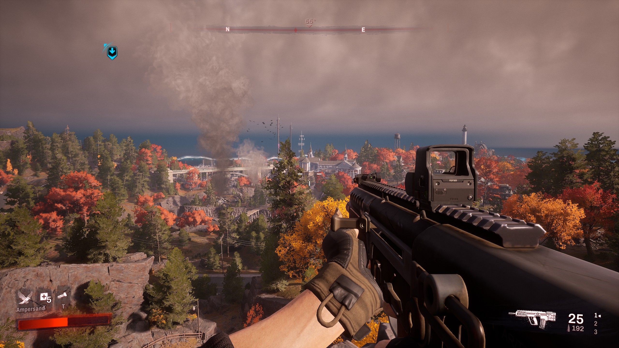 Ville perdue dans l’état presque imprononçable du Massachusetts, Redfall est une jolie bourgade aux couleurs automnales, perchée au-dessus de l’océan. Cliché de la municipalité rurale américaine, cet endroit sans grande prétention offre pourtant un charme indéniable ; dès mon arrivée en jeu, j’ai été happé par les vagues figées dans le temps qui nous succombent, et un Soleil qui émet autant d’ombre que de lumière. Endroits vides, appels de détresse à la radio et groupes d’ennemis montrent clairement que la situation de Redfall n’est pas tenable, et qu’une catastrophe d’origine surnaturelle a éliminé presque tous les habitants.